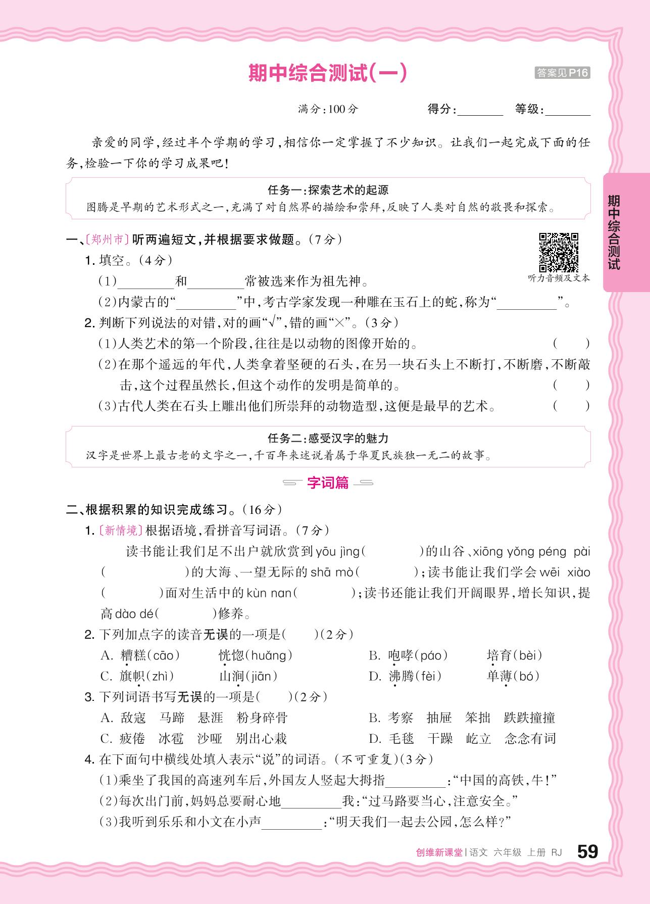 2024秋上册六年级语文人教版 期中综合测试(一)
