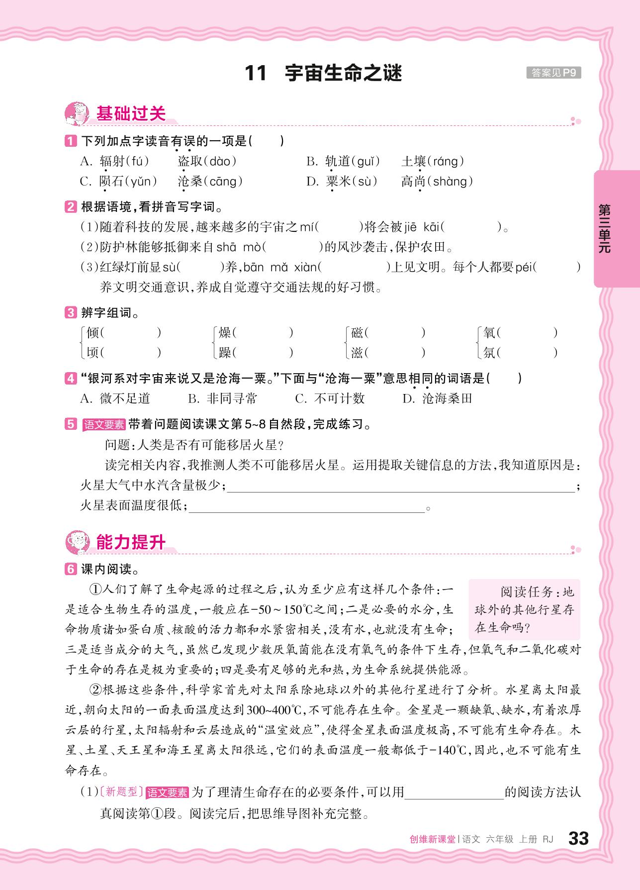 2024秋上册六年级语文人教版 第三单元 有目的地阅读——11. 宇宙生命之谜