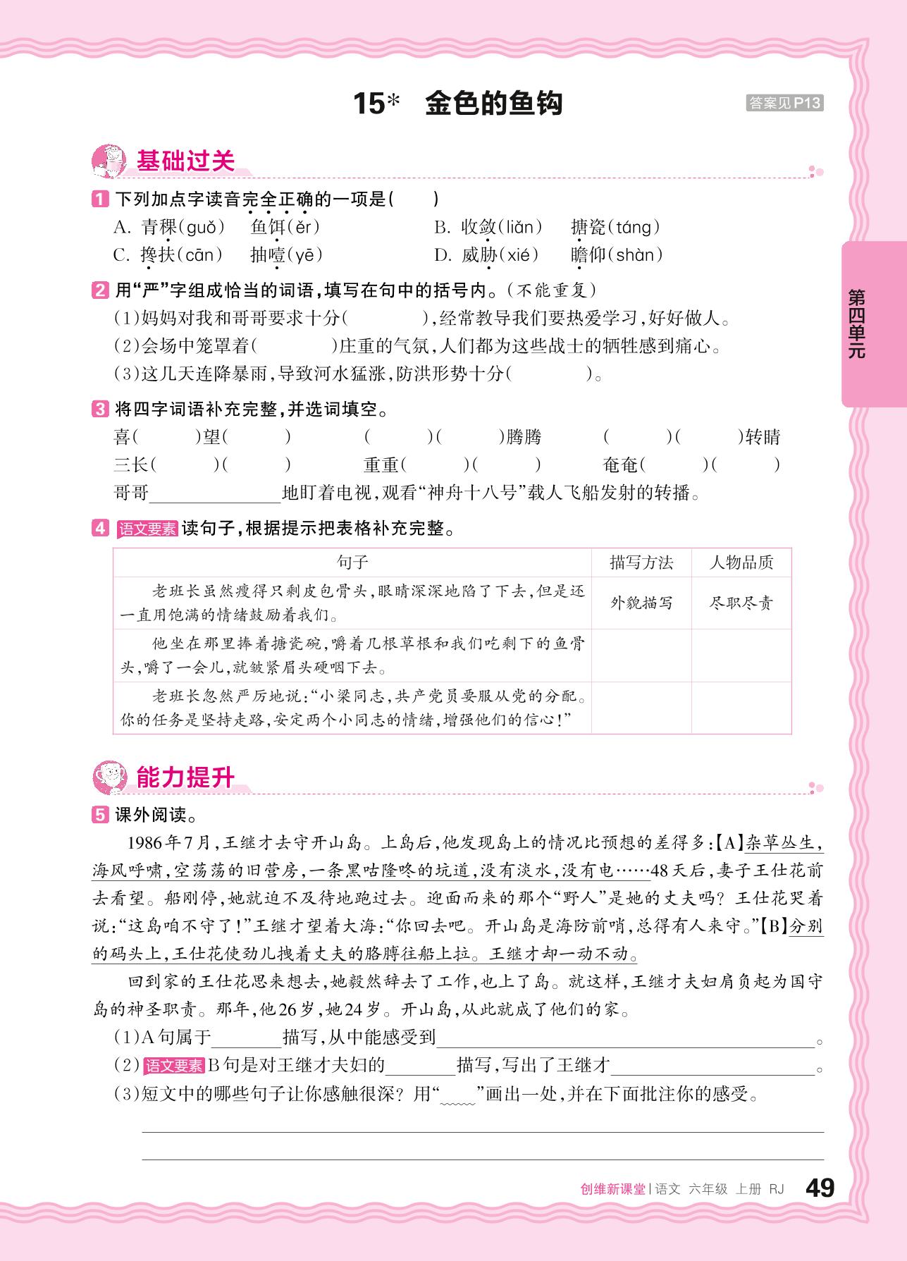 2024秋上册六年级语文人教版 第四单元 小说——15. 金色的鱼钩