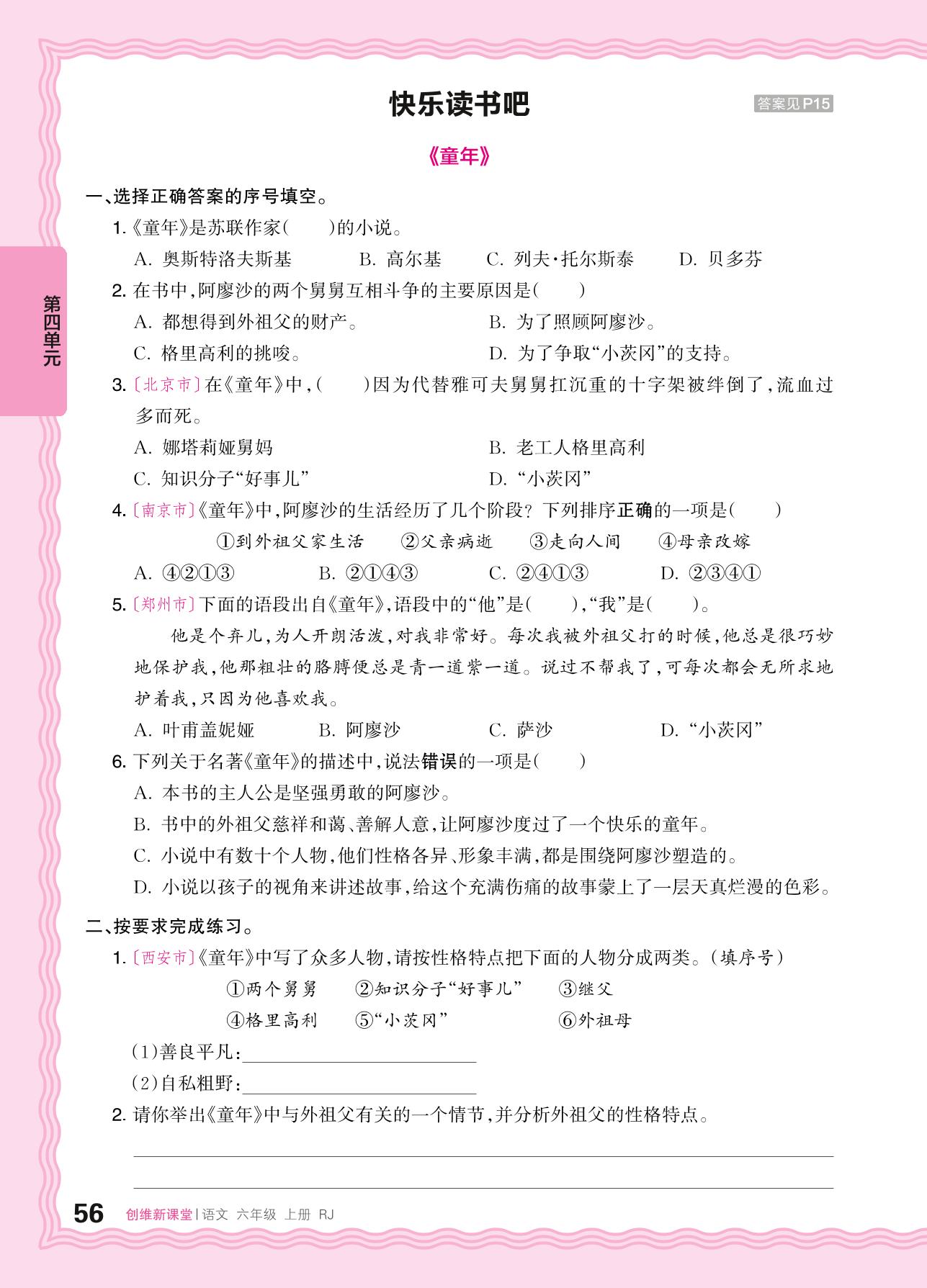 2024秋上册六年级语文人教版 第四单元 小说——快乐读书吧