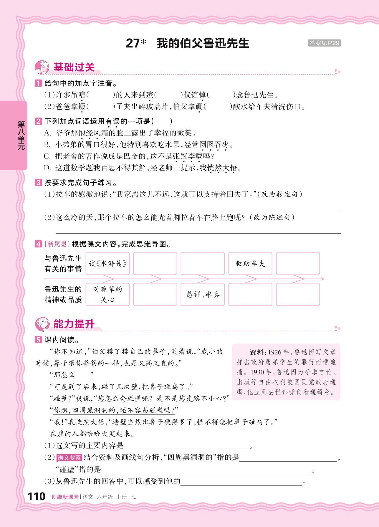 2024秋上册六年级语文人教版 第八单元 走近鲁迅——27. 我的伯父鲁迅先生