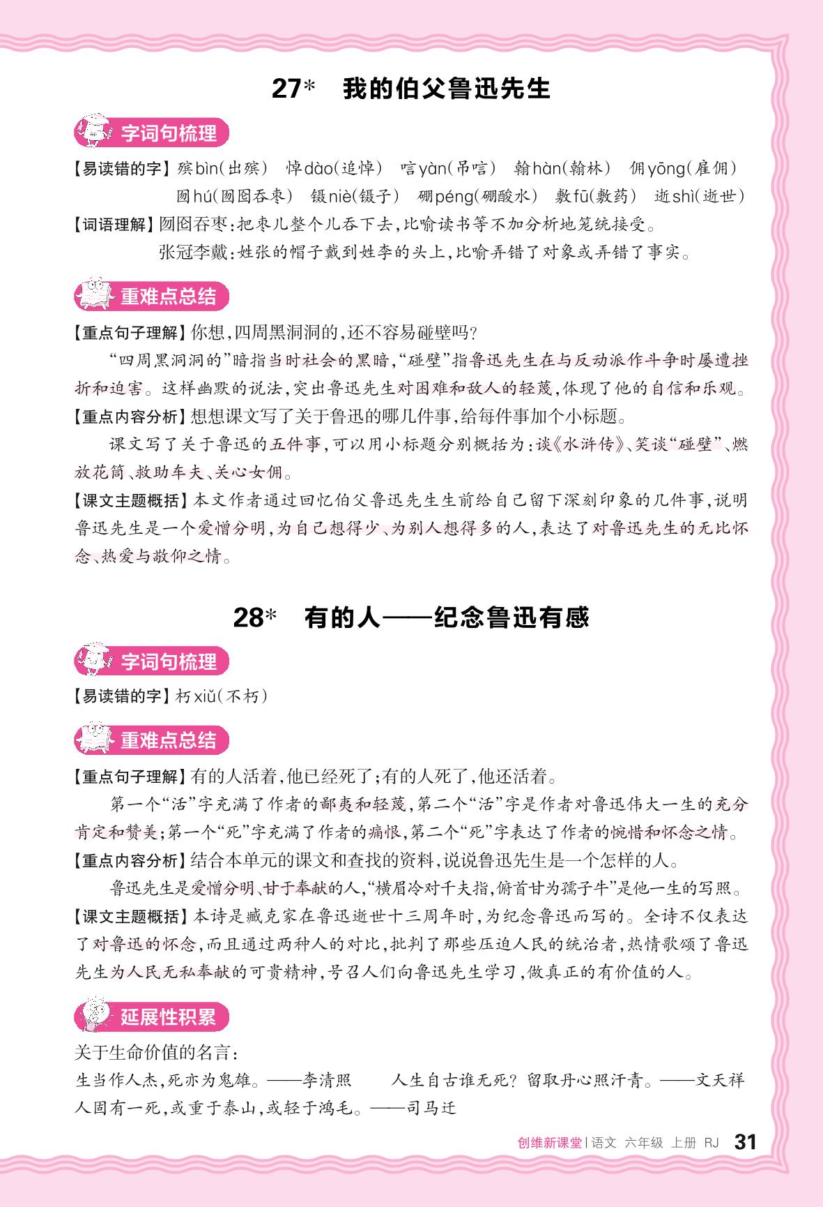 2024秋上册六年级语文人教版 助学手册 第八单元——28. 有的人——纪念鲁迅有感
