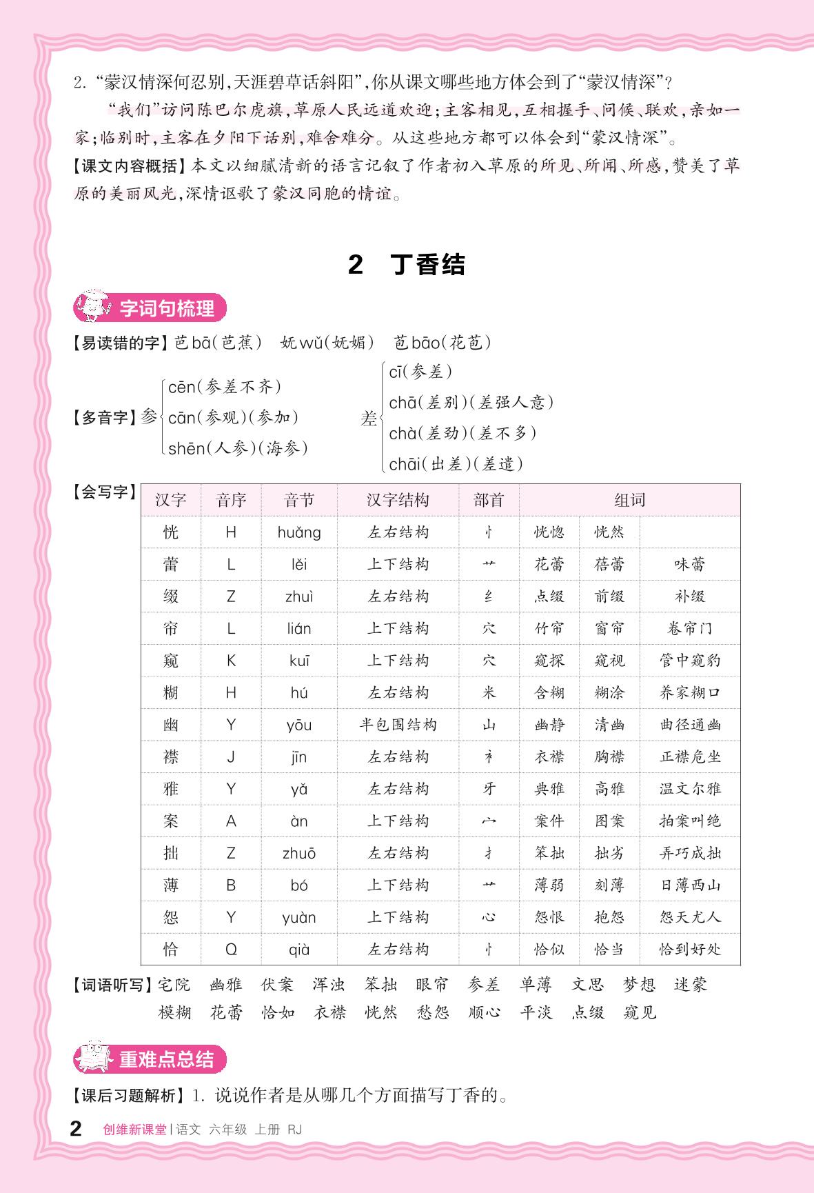 2024秋上册六年级语文人教版 助学手册 第一单元——2. 丁香结