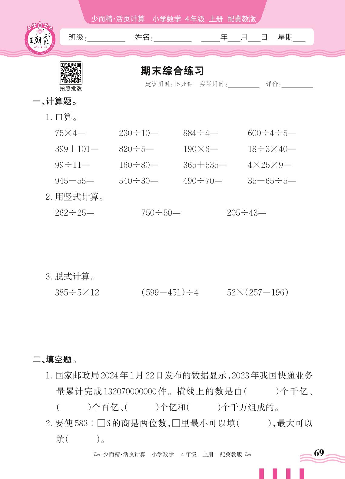 2024秋上册四年级数学冀教版 期末综合练习(计算专练)