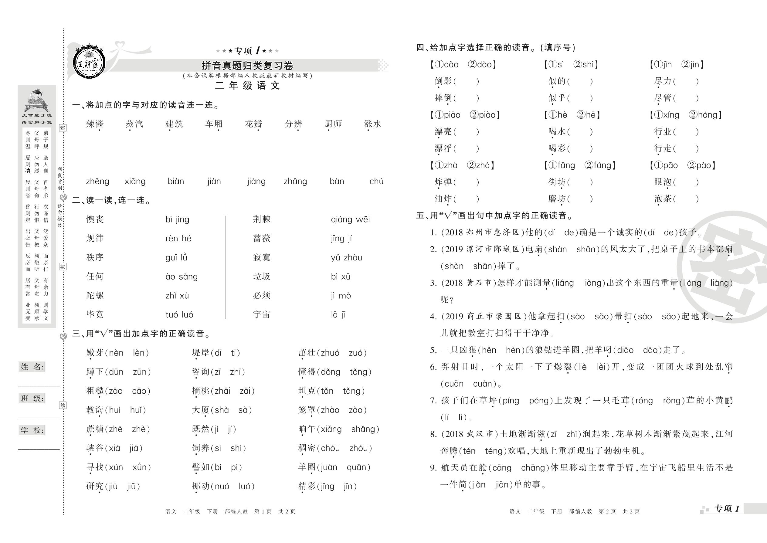 王朝霞期末专项卷——拼音、汉字真题归类复习卷二年级下册语文(人教版)_R21080170540【0】
