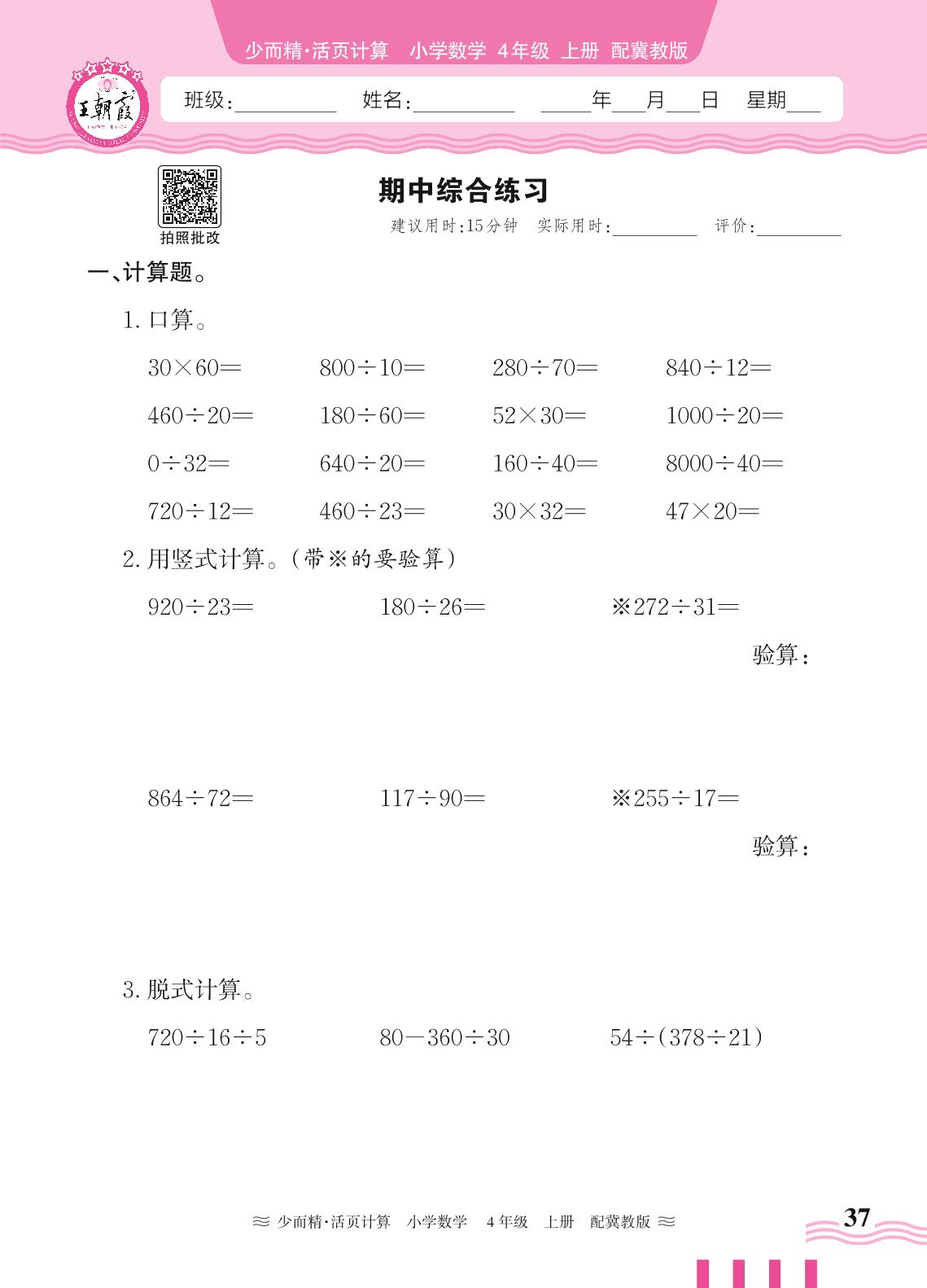 2024秋上册四年级数学冀教版 期中综合练习(计算专练)