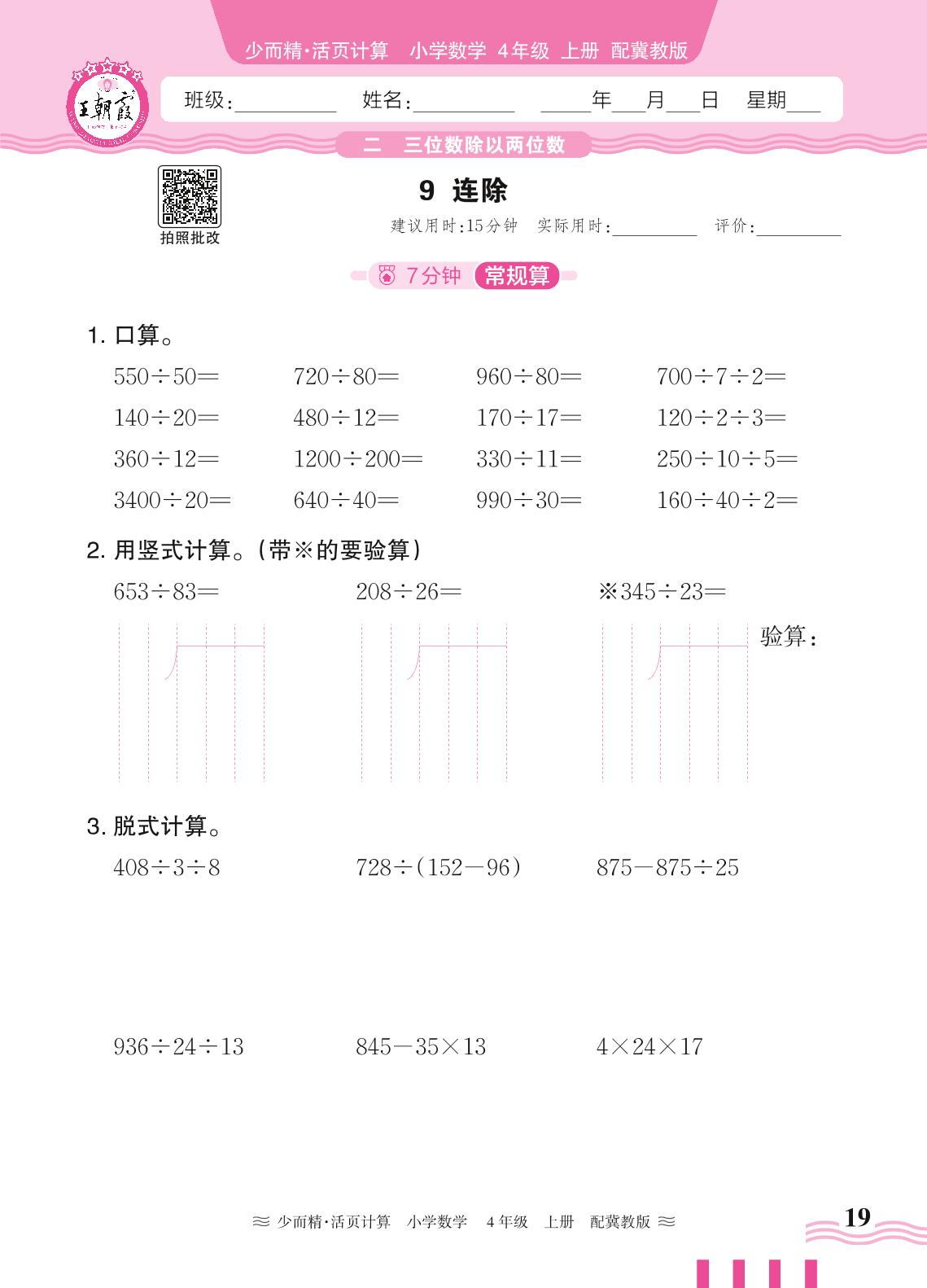 2024秋上册四年级数学冀教版 第二单元 三位数除以两位数——9. 连除_R240819100214305