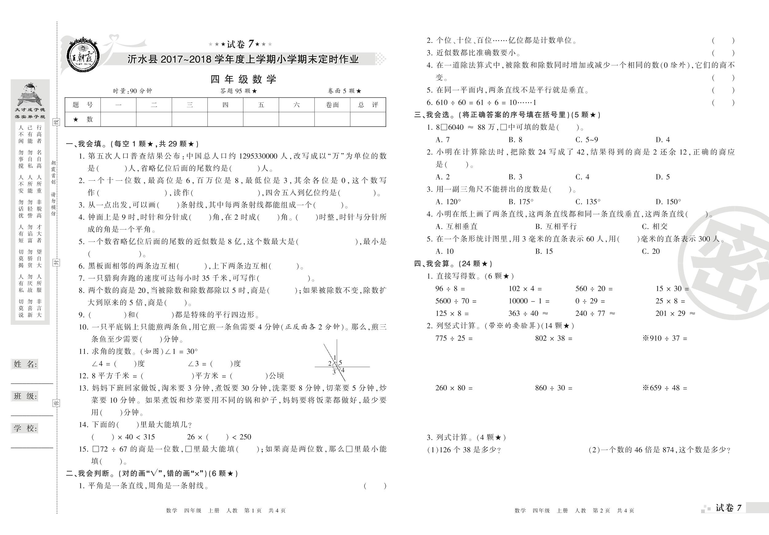 2017-2018学年第一学期临沂市沂水县四年级数学试卷(人教版)【7】
