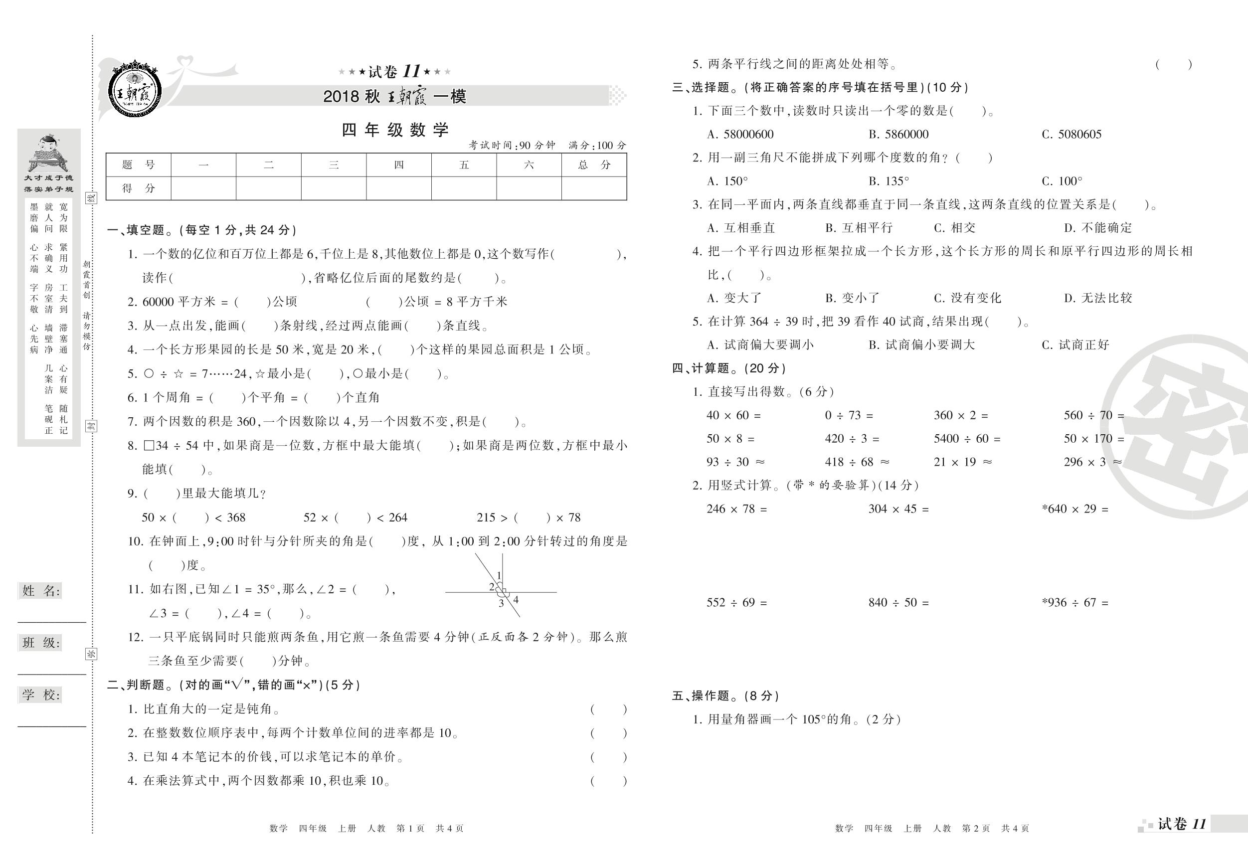 王朝霞期末模拟卷四年级上册数学(人教版)_R210804154740【11】