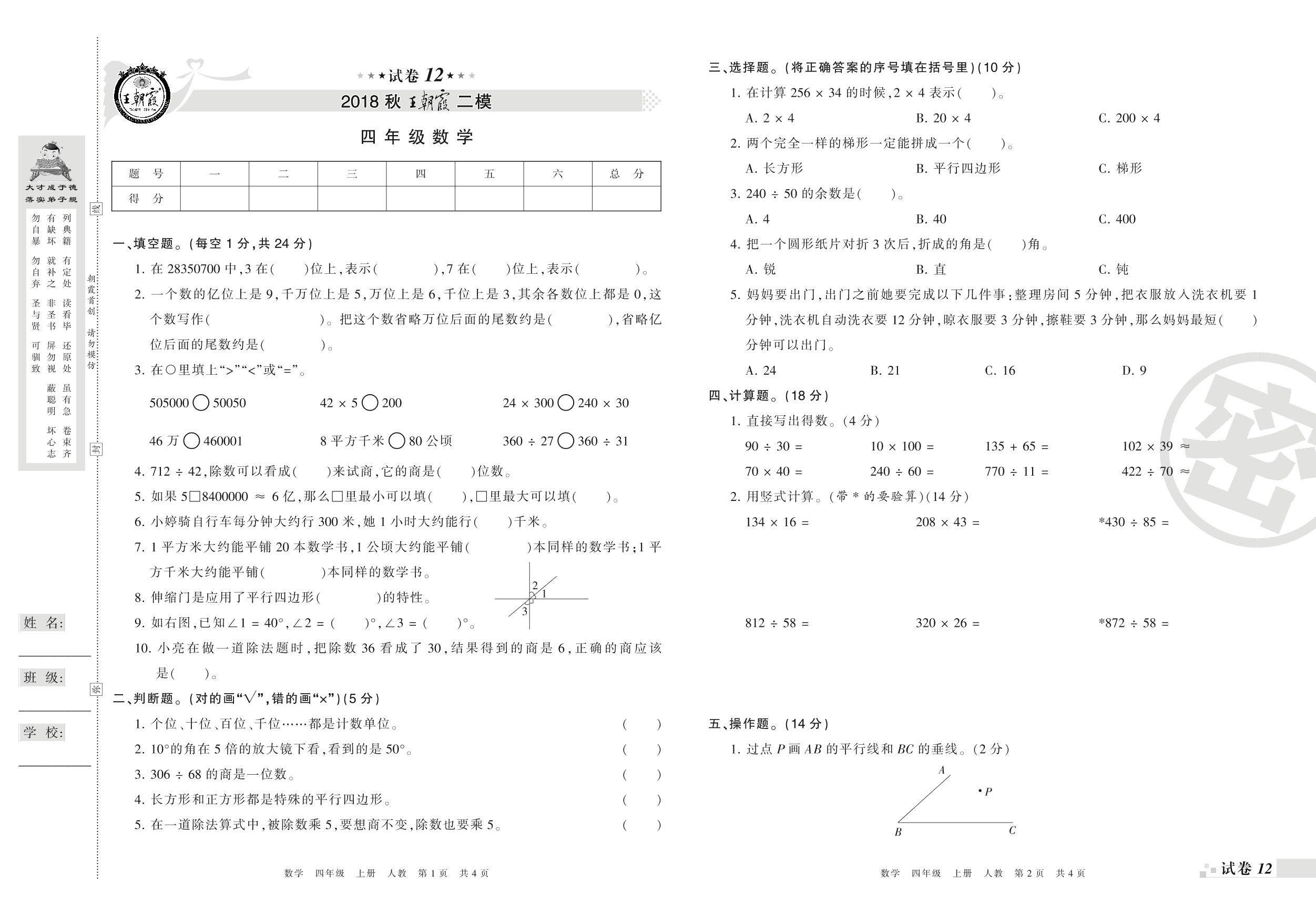 王朝霞期末模拟卷四年级上册数学(人教版)【12】