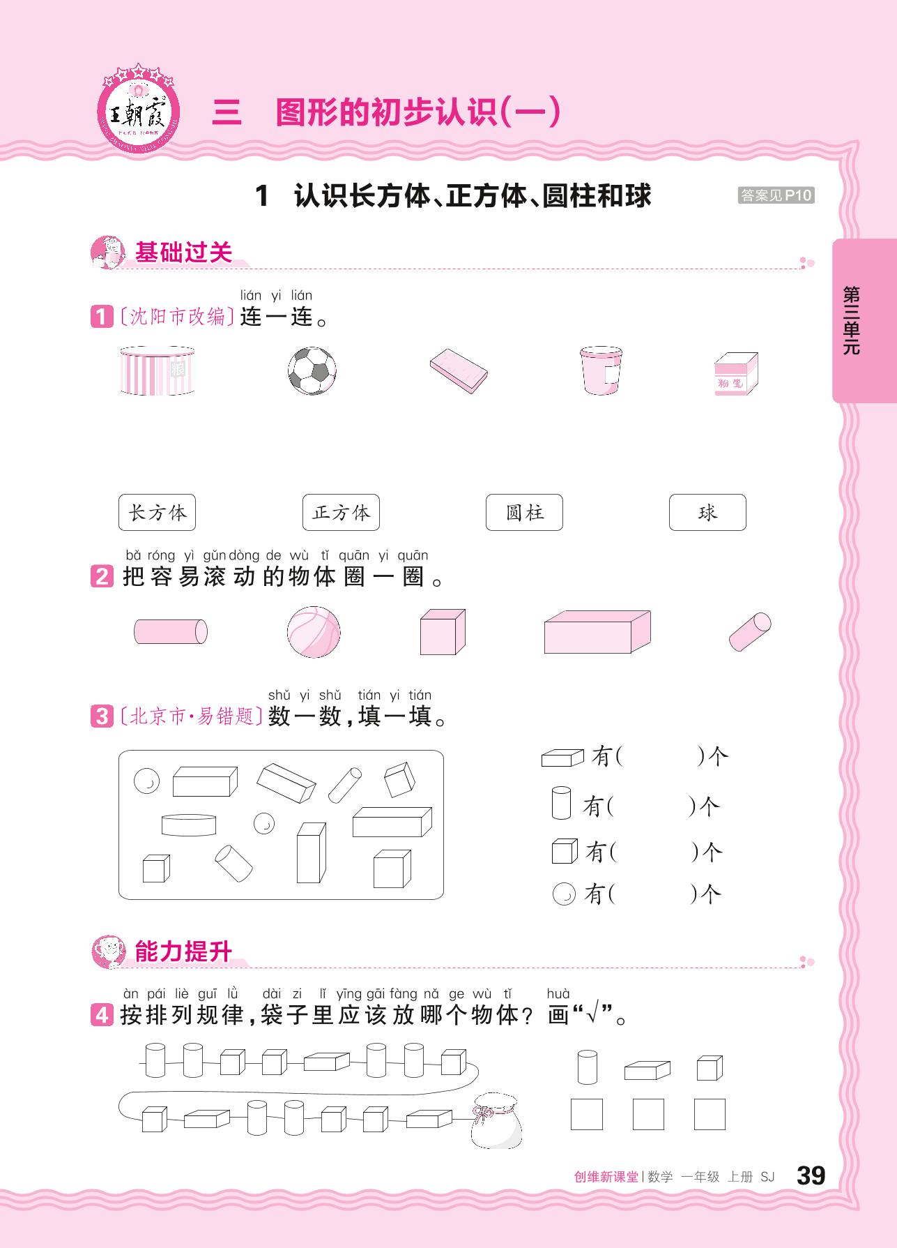 2024秋上册一年级数学苏教版 第三单元 图形的初步认识(一)——1. 认识长方体、正方体、圆柱和球