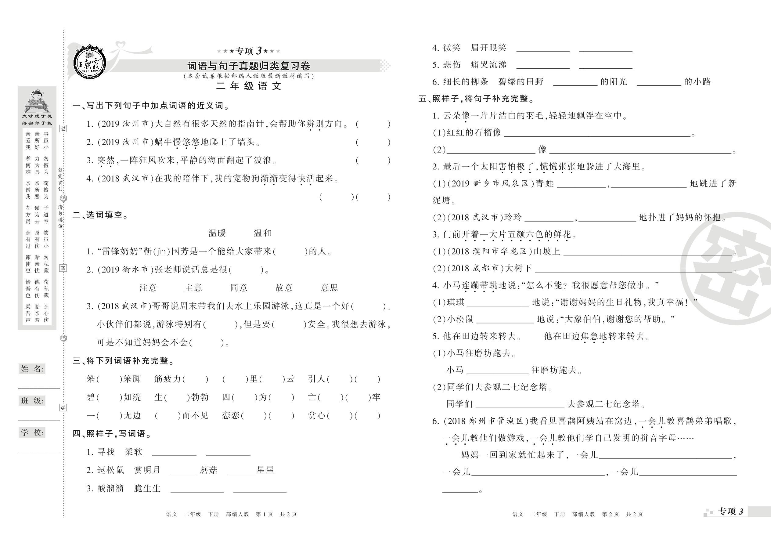 王朝霞期末专项卷——词语与句子、课文内容与积累运用真题归类复习卷二年级下册语文(人教版)_R21080170542【0】