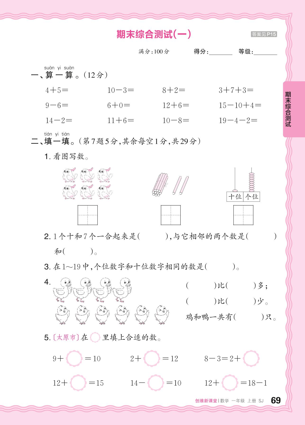 2024秋上册一年级数学苏教版 期末综合测试(一)