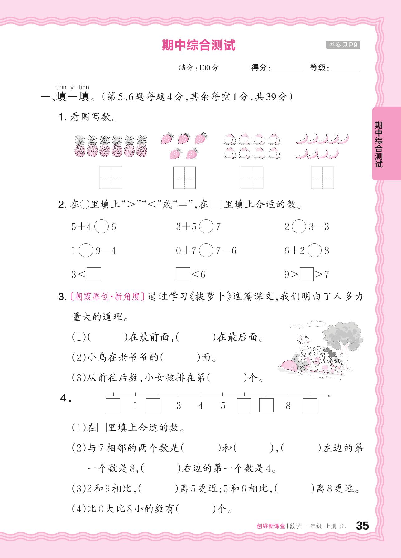 2024秋上册一年级数学苏教版 期中综合测试