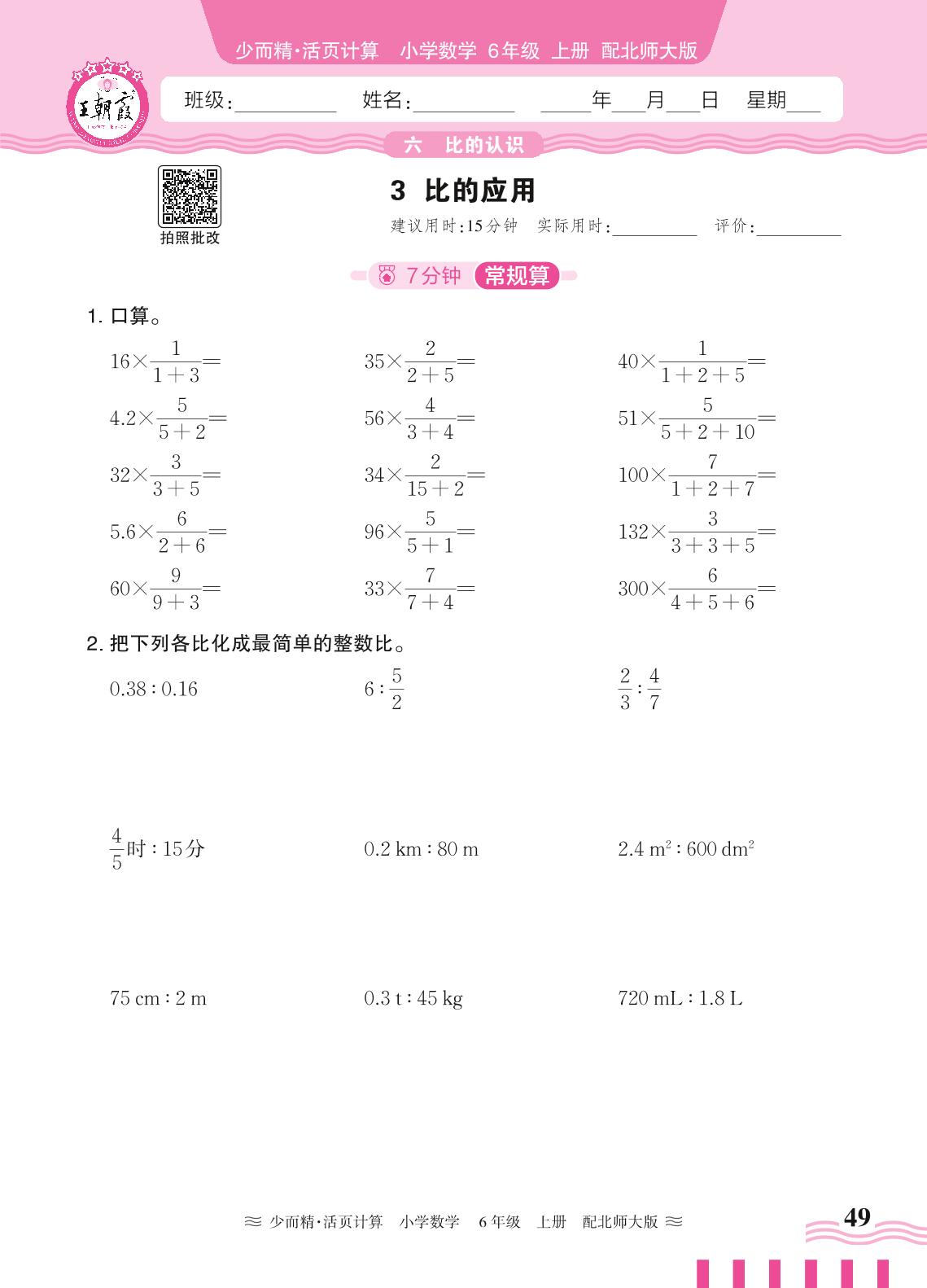 2024秋上册六年级数学北师版 第六单元 比的认识——3. 比的应用