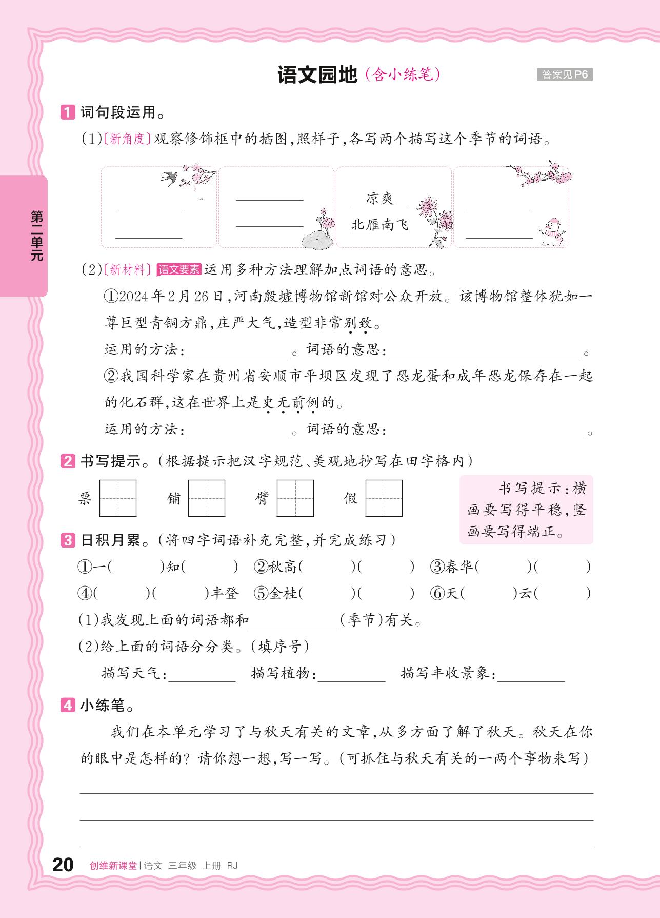 2024秋上册三年级语文人教版 第二单元 金秋时节——语文园地(含小练笔)