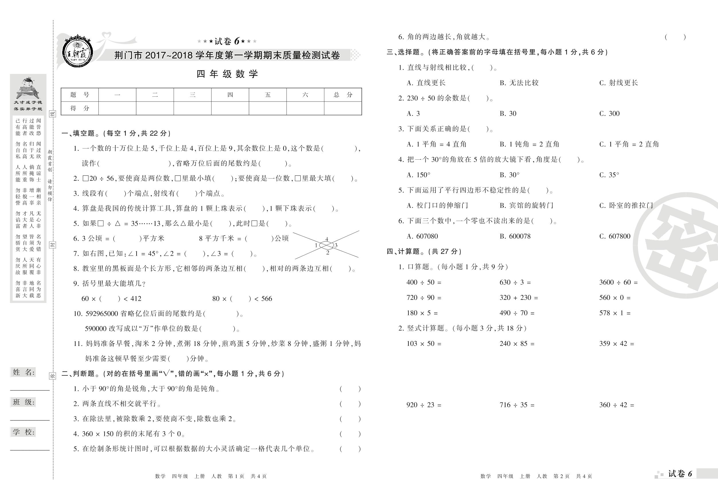 2017-2018学年第一学期荆门市四年级数学试卷(人教版)【6】