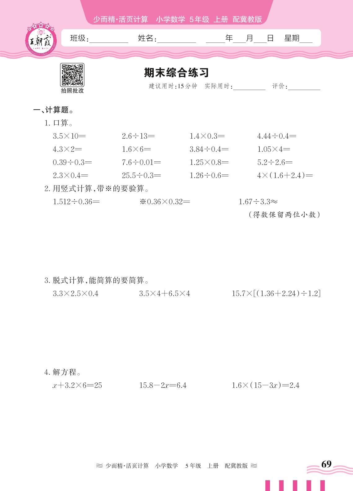 2024秋上册五年级数学冀教版 期末综合练习(计算专练)