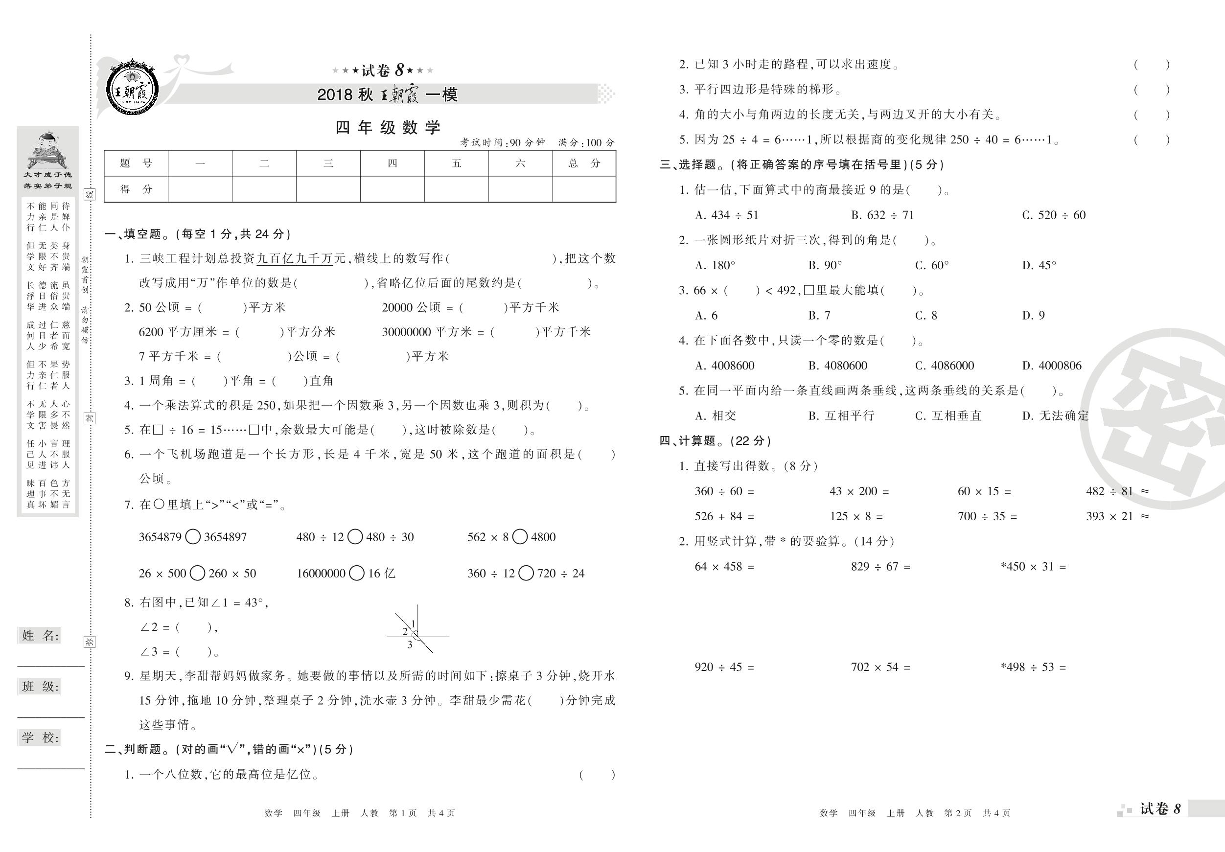 王朝霞期末模拟卷四年级上册数学(人教版)_R210804154828【8】