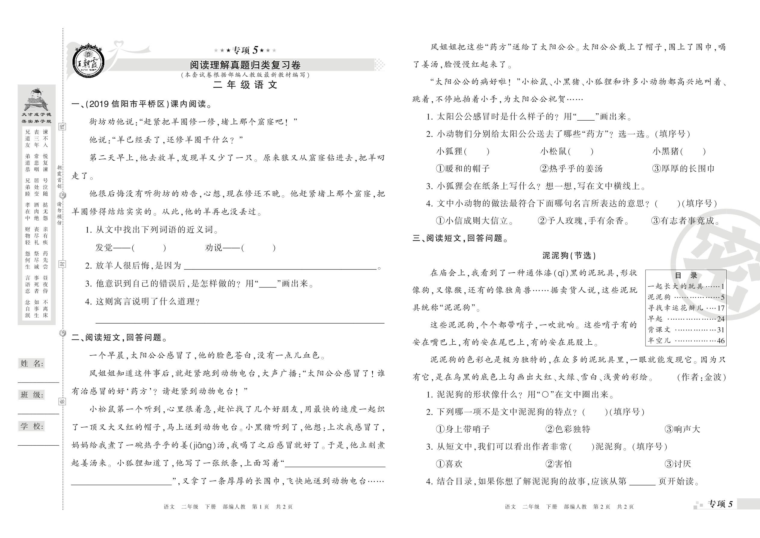 王朝霞期末专项卷——阅读理解、写话真题归类复习卷二年级下册语文(人教版)_R21080170546【0】