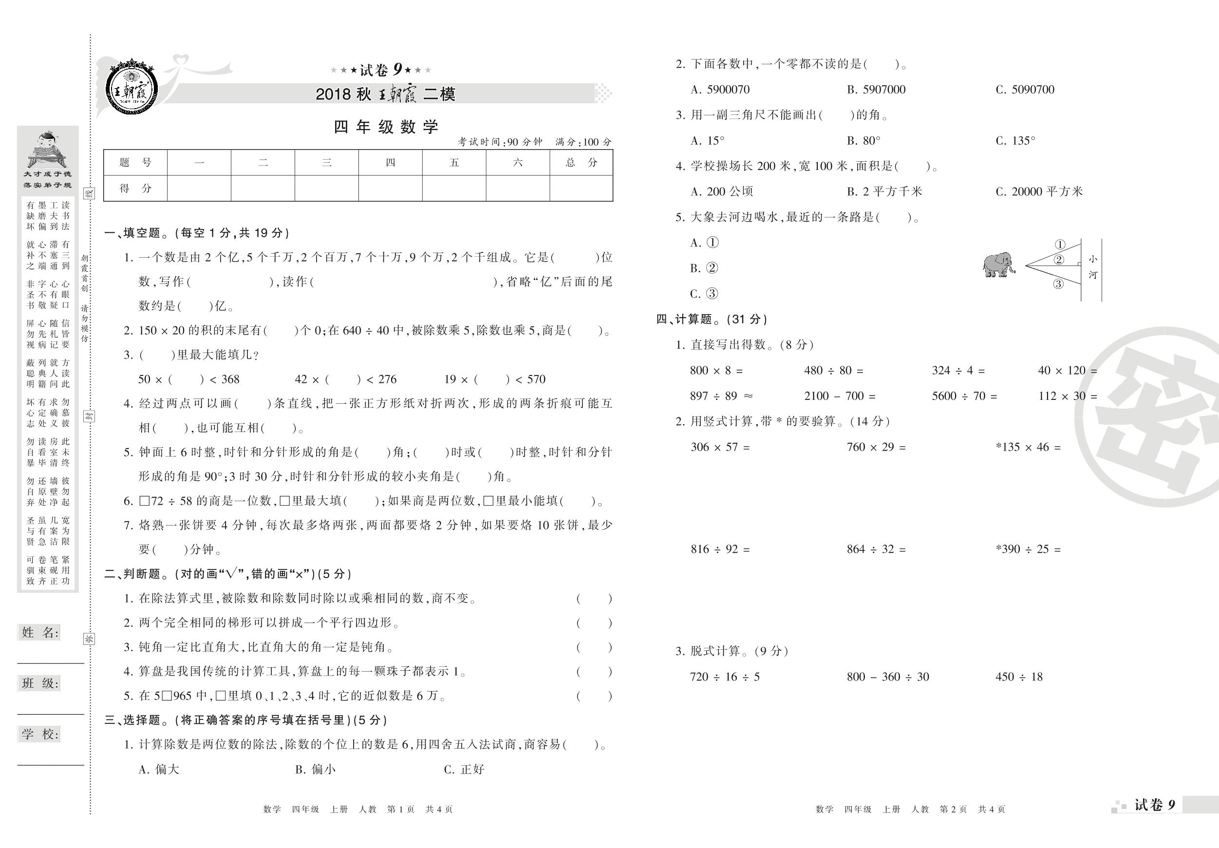王朝霞期末模拟卷四年级上册数学(人教版)_R210804154832【9】