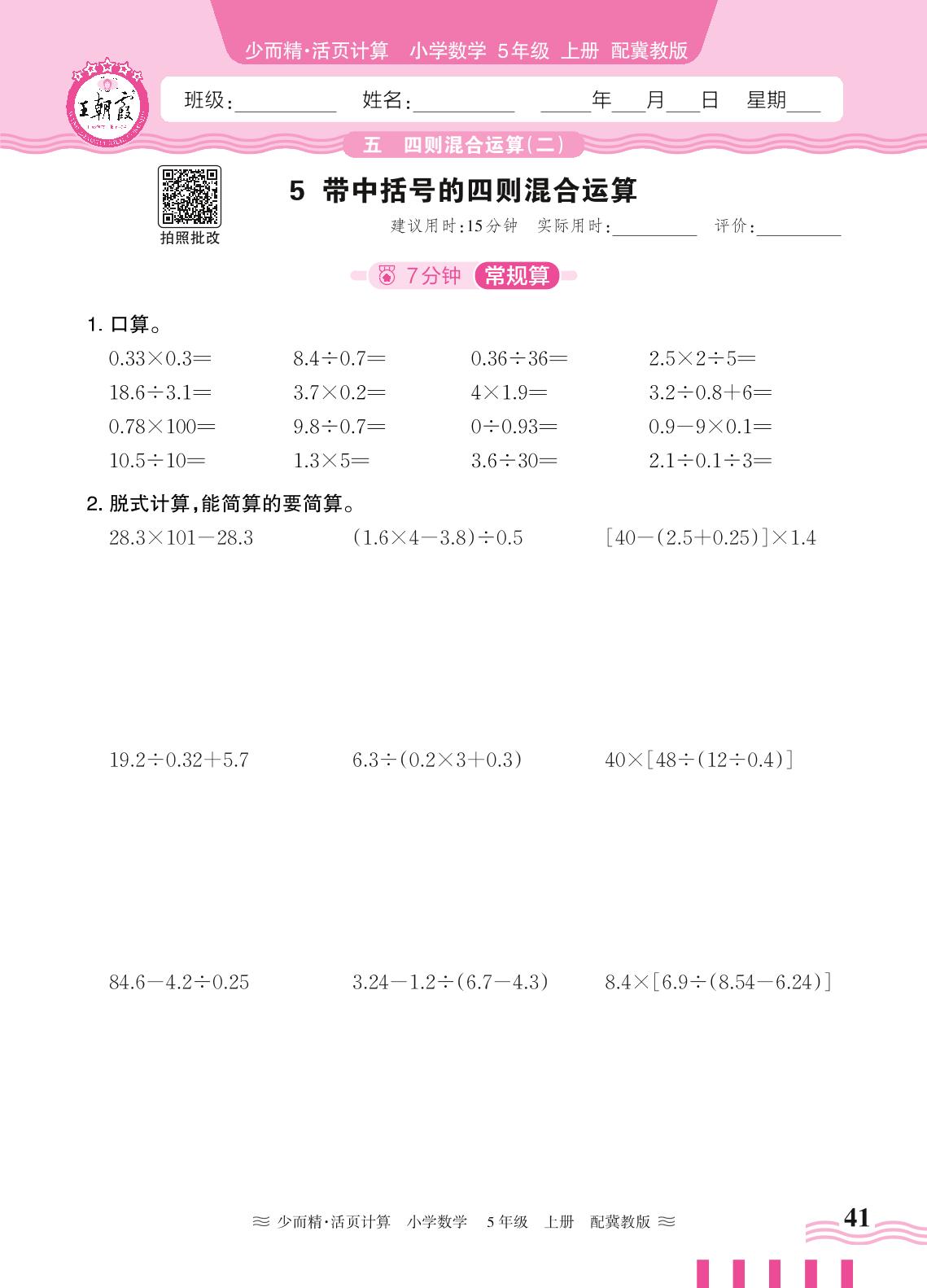 2024秋上册五年级数学冀教版 第五单元 四则混合运算(二)——5. 带中括号的四则混合运算