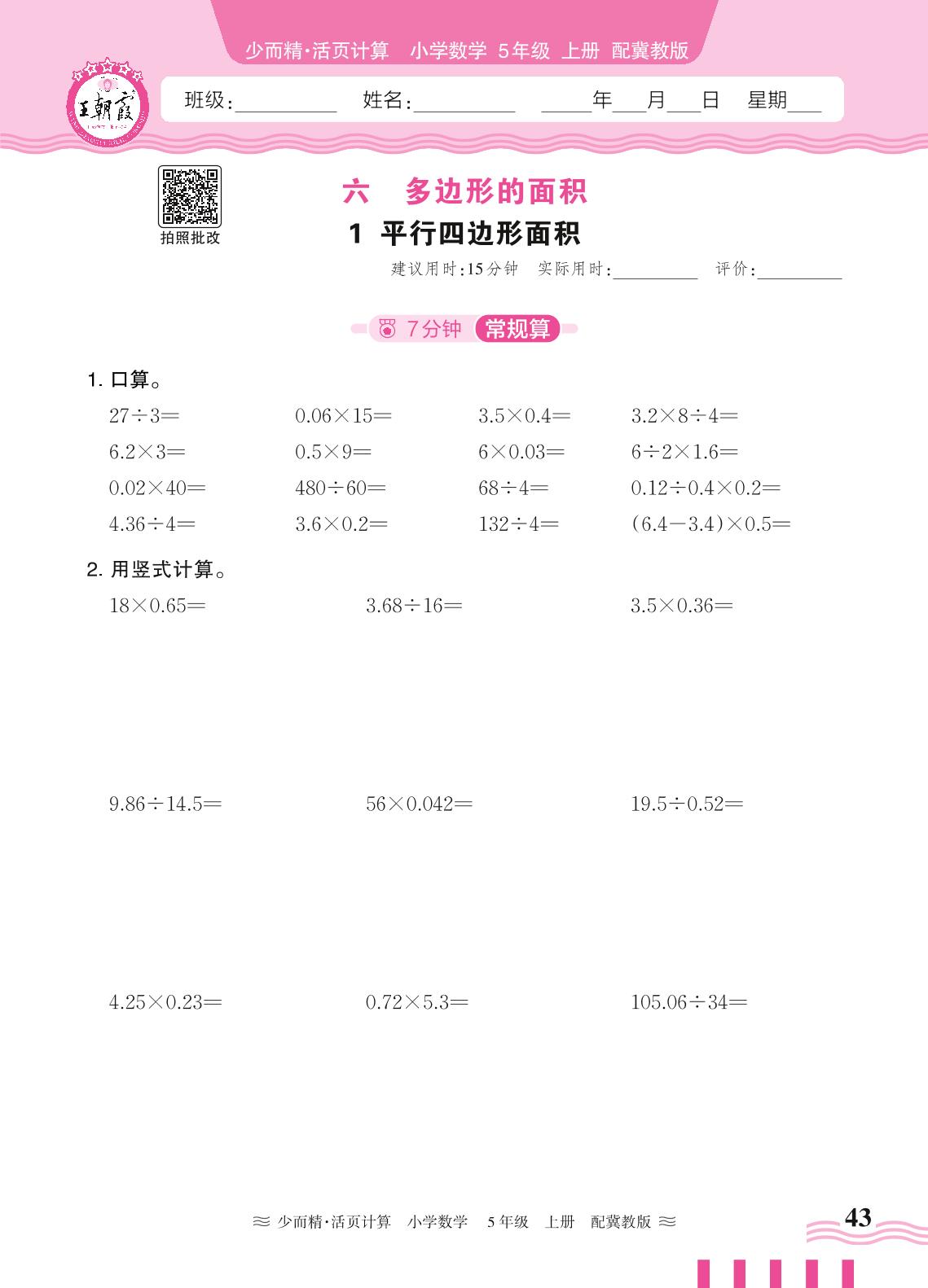 2024秋上册五年级数学冀教版 第六单元 多边形的面积——1. 平行四边形面积_R240819101456286