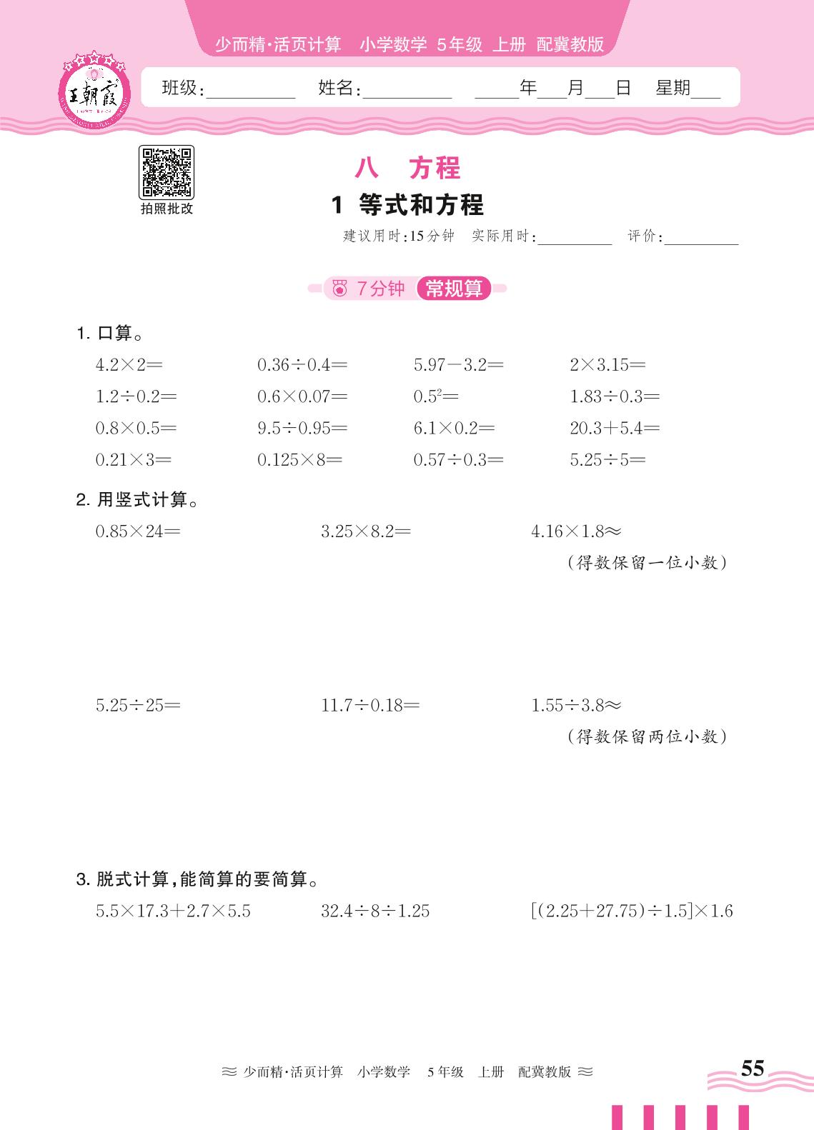 2024秋上册五年级数学冀教版 第八单元 方程——1. 等式和方程_R240819101458413
