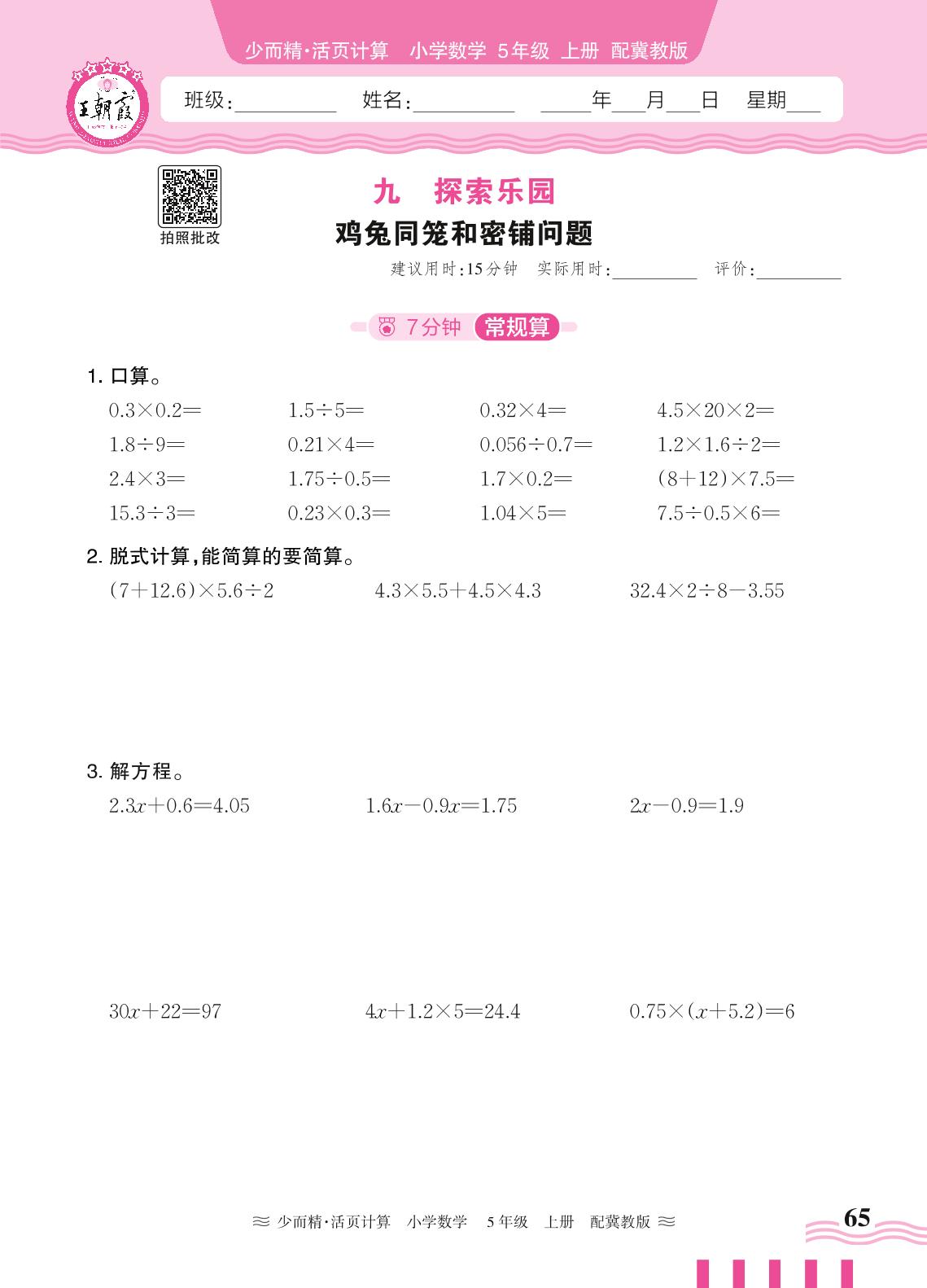 2024秋上册五年级数学冀教版 第九单元 探索乐园——鸡兔同笼和密铺问题