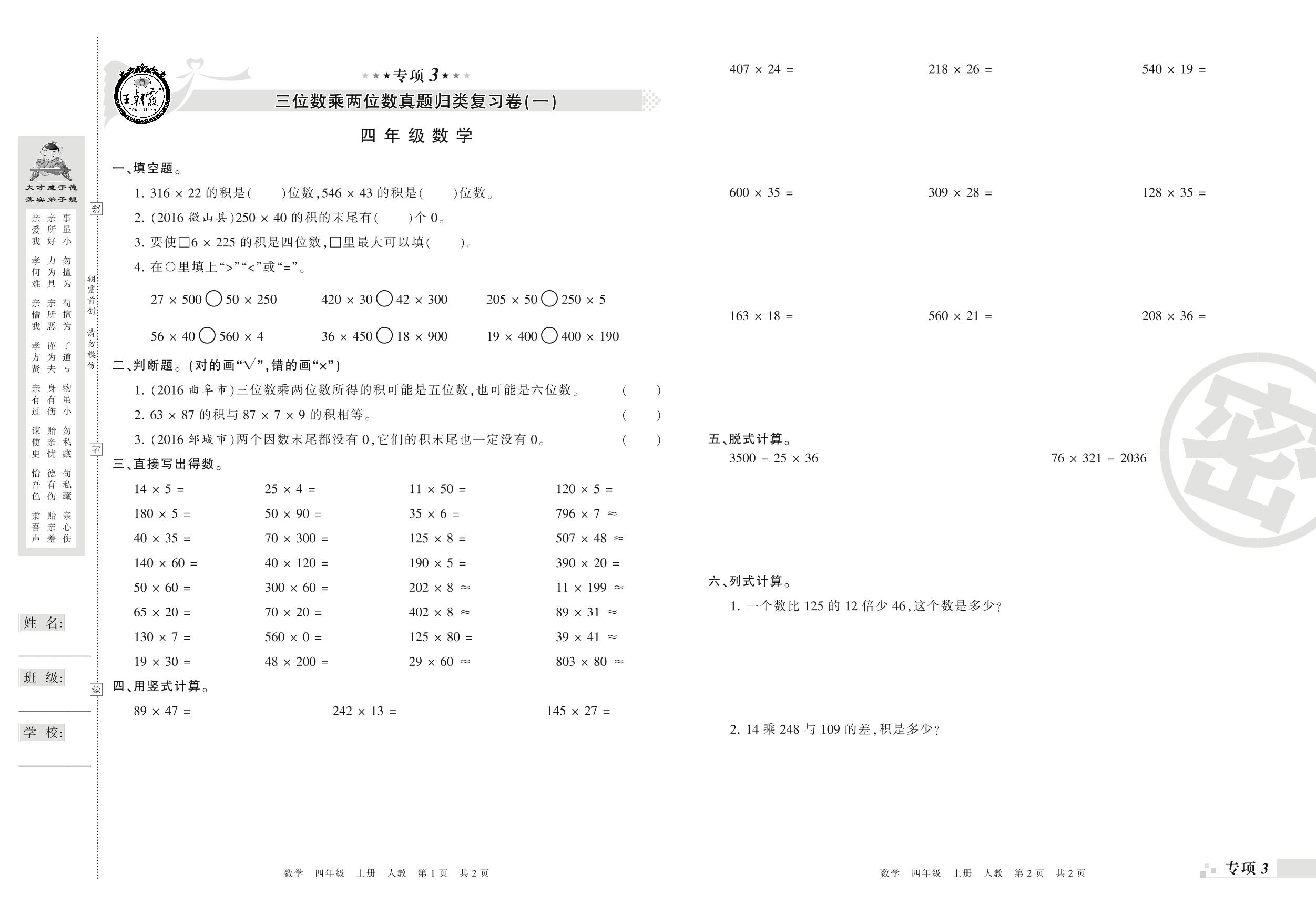 王朝霞期末专项卷——三位数乘两位数(一)(二)真题归类复习卷四年级上册数学(人教版)_R210804154841【0】