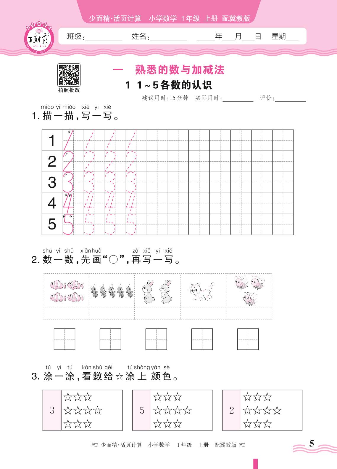 2024秋上册一年级数学冀教版 第一单元 熟悉的数与加减法——1. 1~5各数的认识