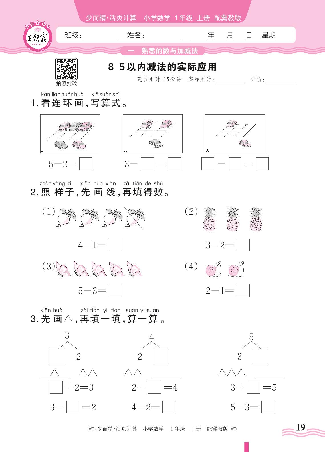 2024秋上册一年级数学冀教版 第一单元 熟悉的数与加减法——8. 5以内减法的实际应用