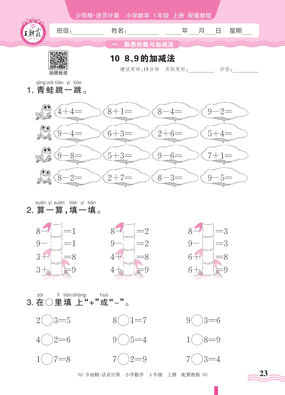 2024秋上册一年级数学冀教版 第一单元 熟悉的数与加减法——10. 8、9的加减法
