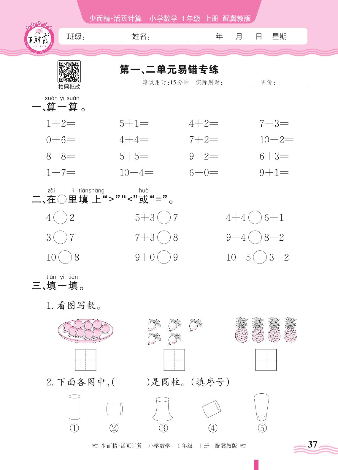2024秋上册一年级数学冀教版 第一、二单元易错专练