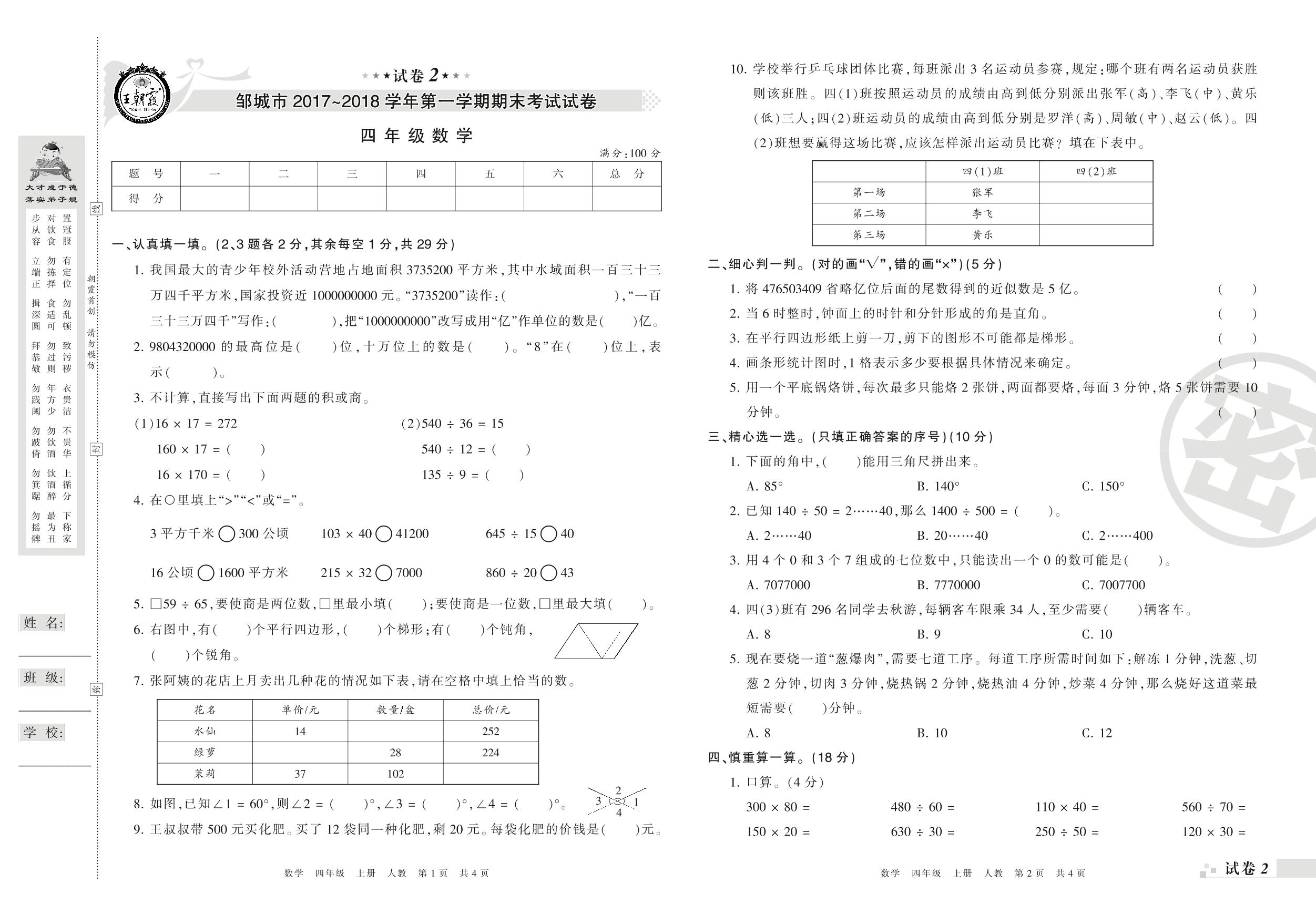 2017-2018学年第一学期邹城市四年级数学试卷(人教版)【2】