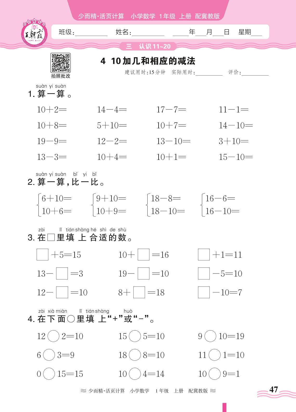 2024秋上册一年级数学冀教版 第三单元 认识11~20——4. 10加几和相应的减法