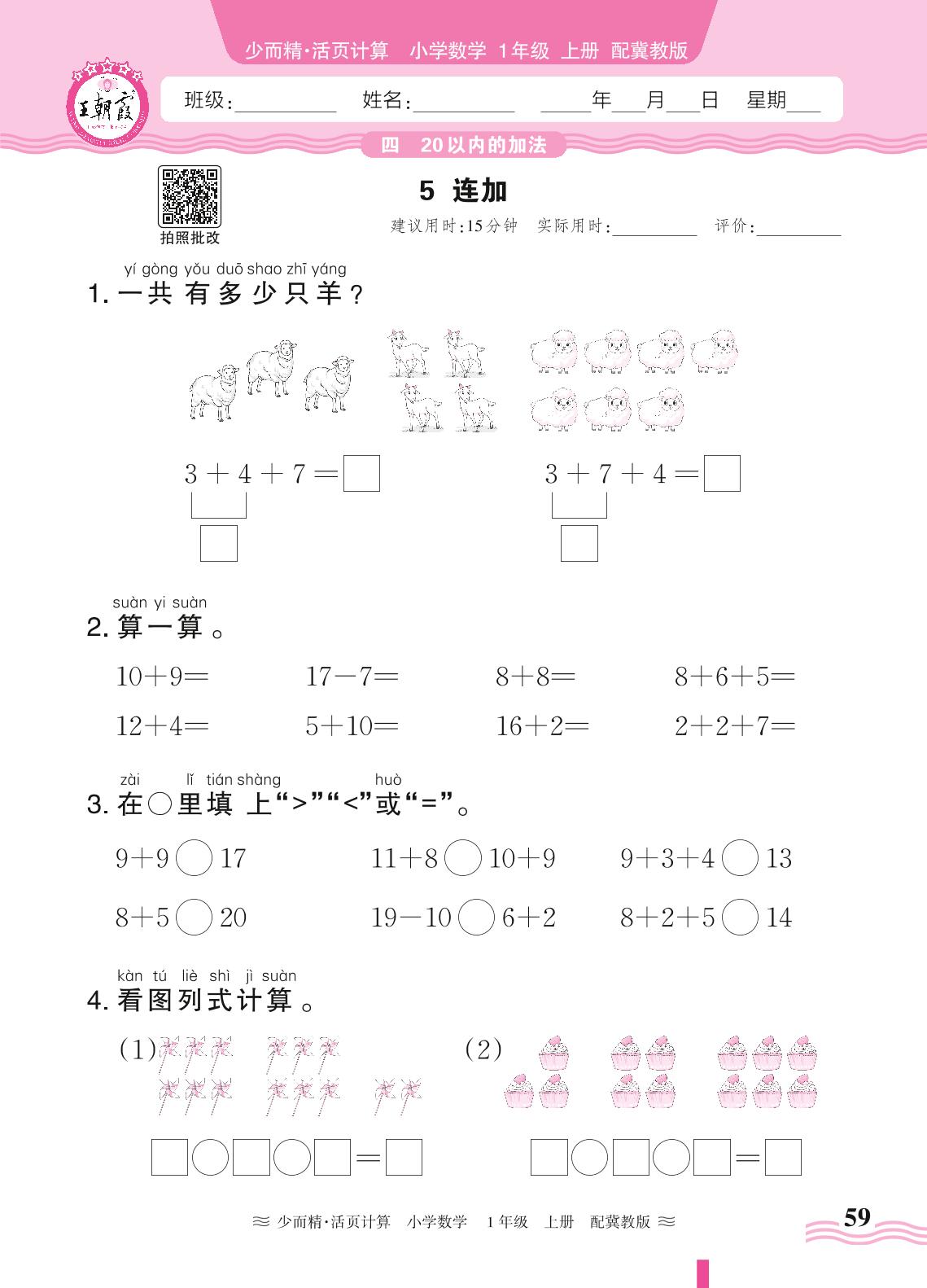 2024秋上册一年级数学冀教版 第四单元 20以内的加法——5. 连加_R240819102149094