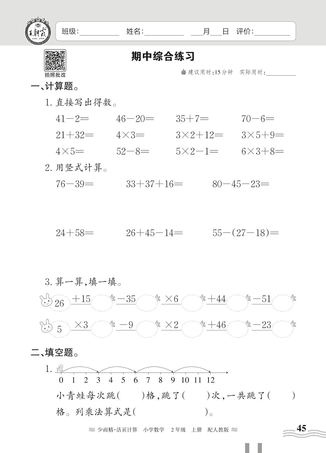 2024秋上册二年级数学人教版 期中综合练习(计算专练)