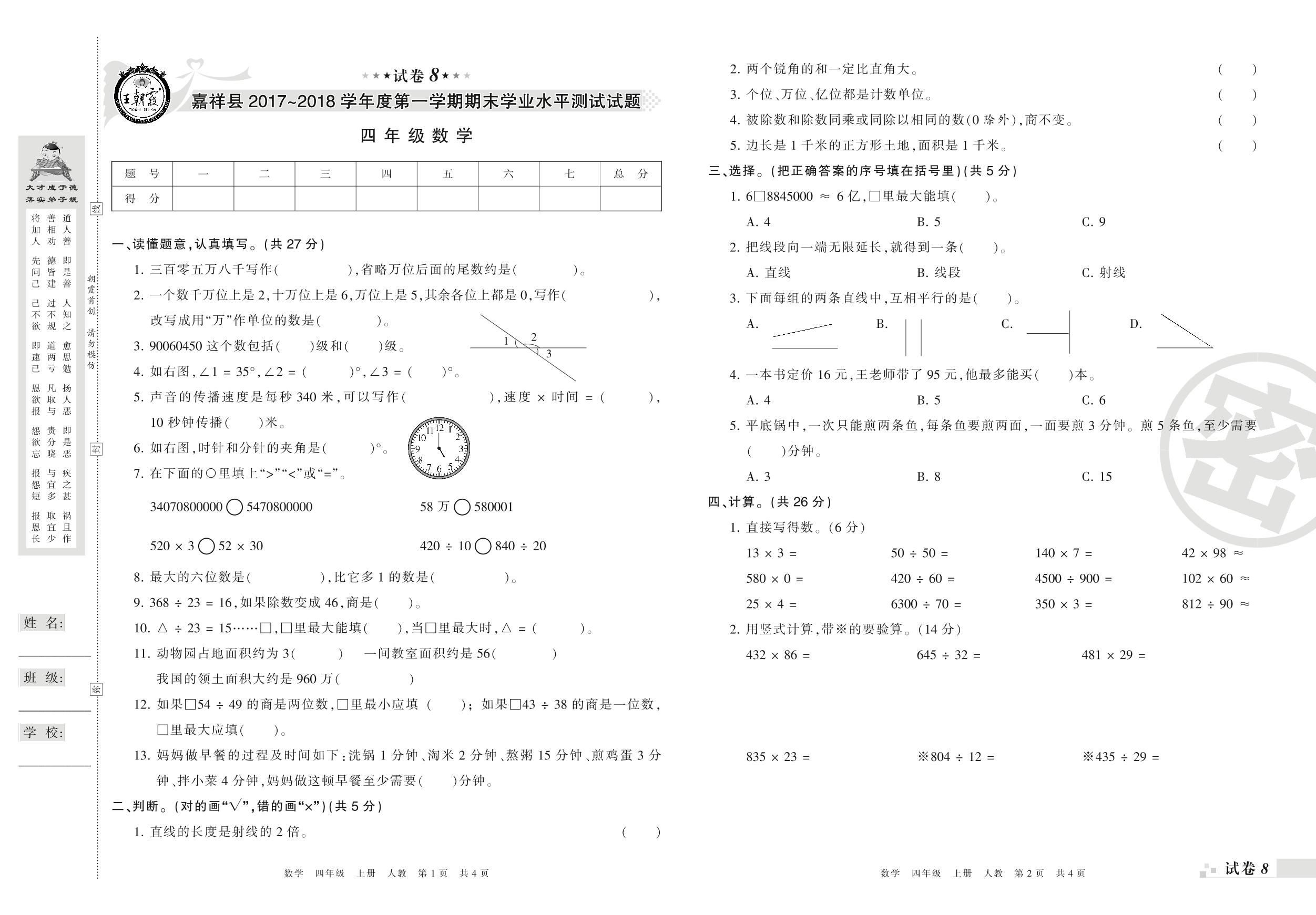 2017-2018学年第一学期济宁市嘉祥县四年级数学试卷(人教版)【8】