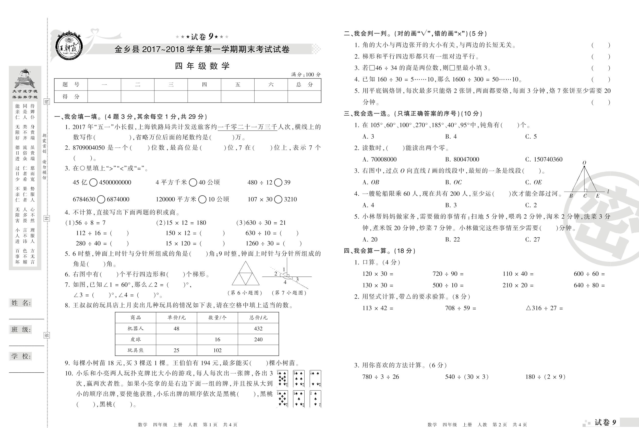 2017-2018学年第一学期济宁市金乡县四年级数学试卷(人教版)【9】