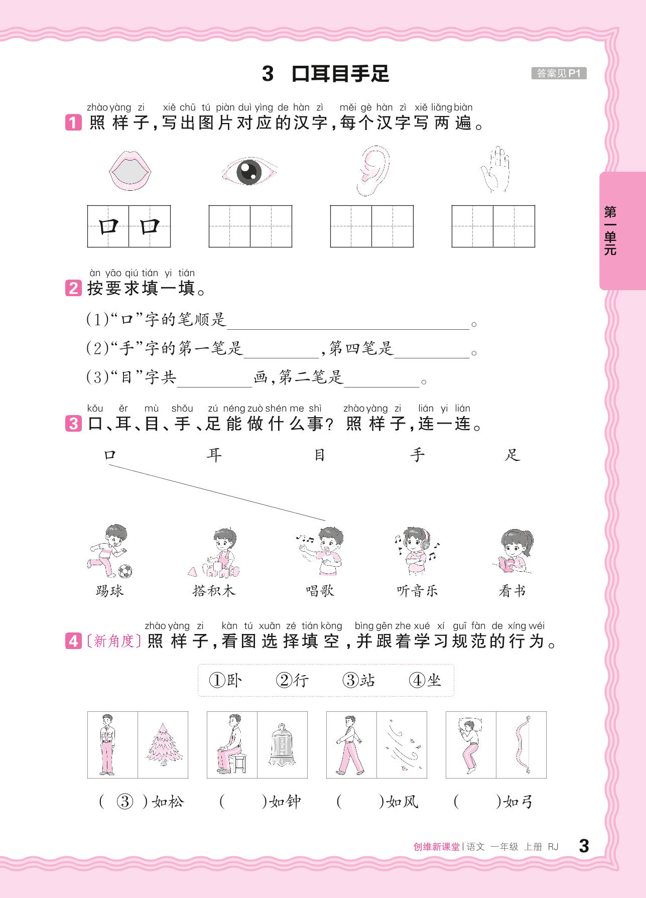 2024秋上册一年级语文人教版 第一单元 识字——3. 口耳目手足_R240819103135508