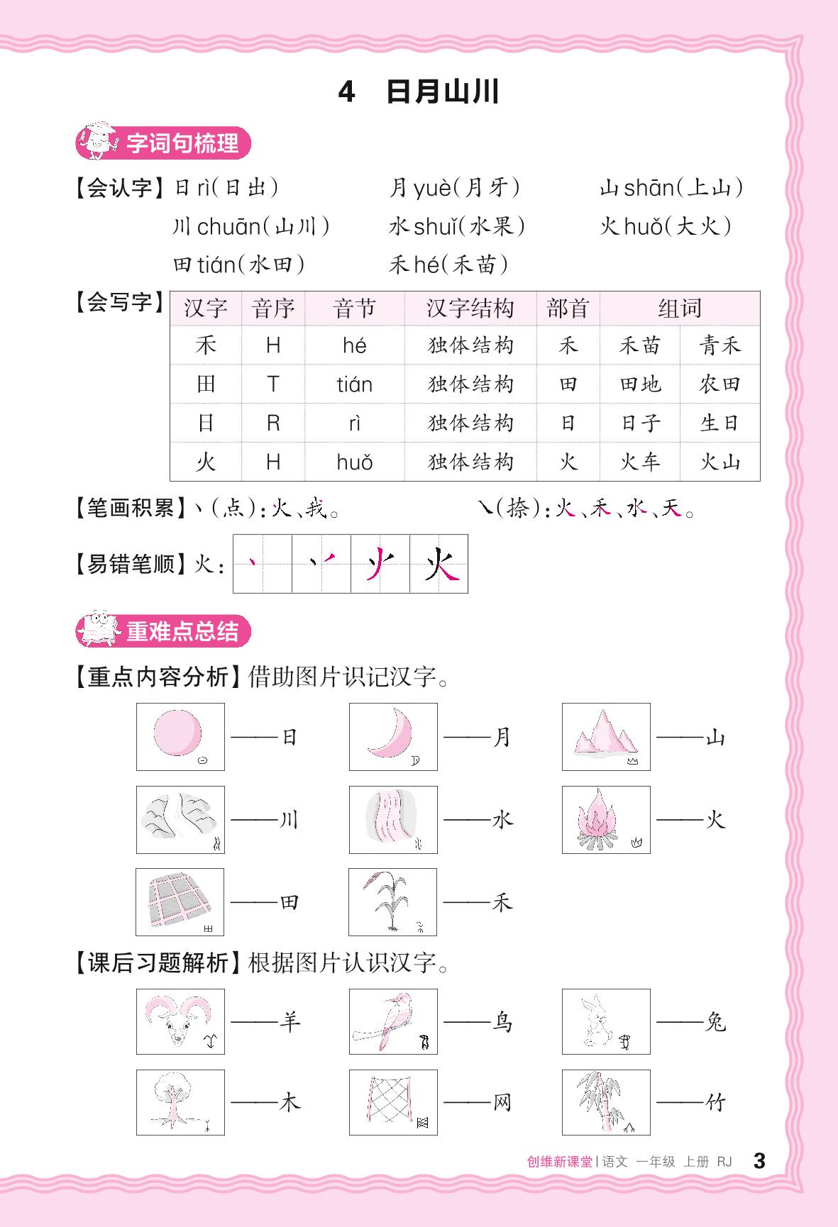 2024秋上册一年级语文人教版 助学手册 第一单元——4. 日月山川