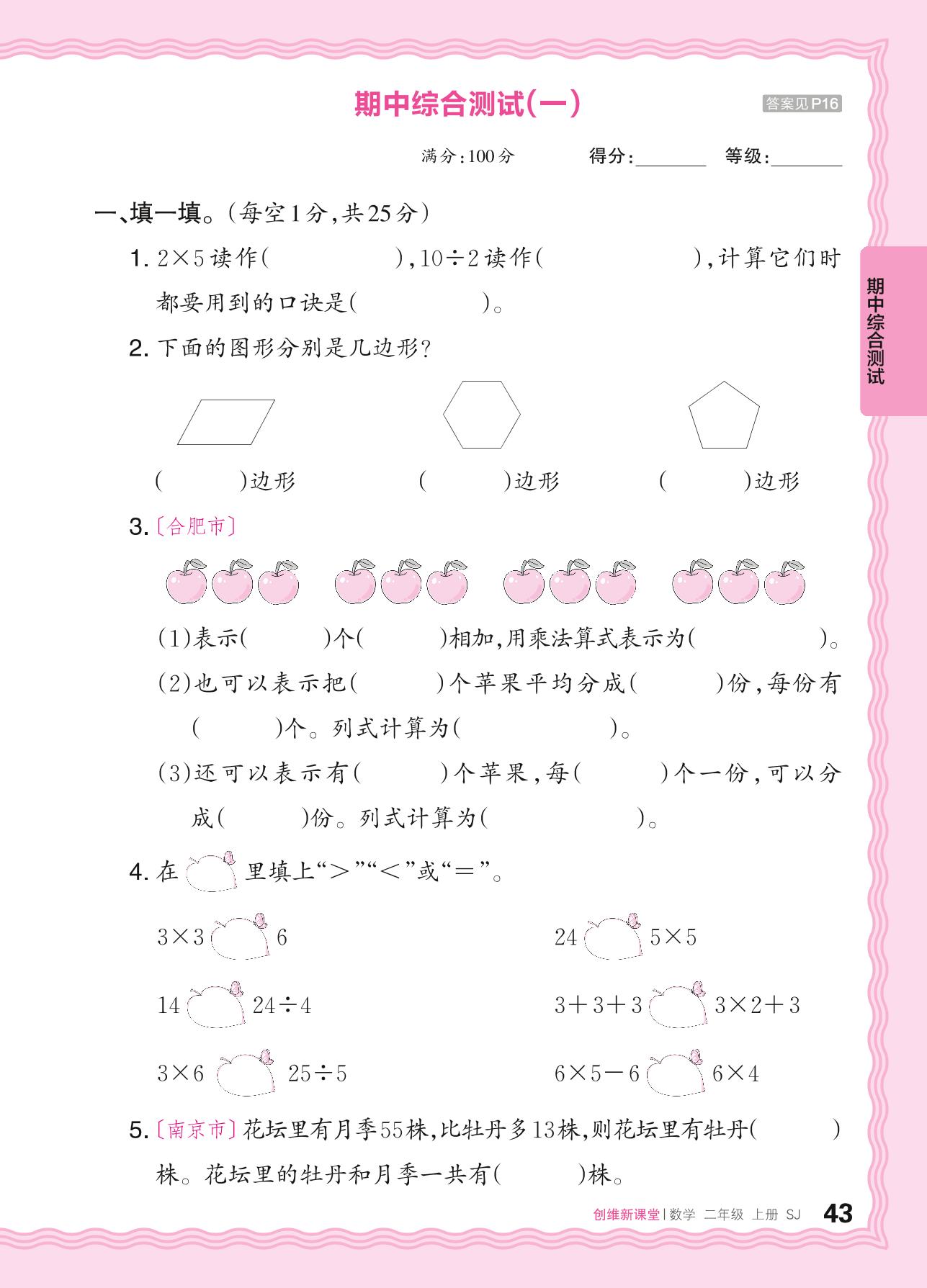 二年级数学苏教版上册期中卷