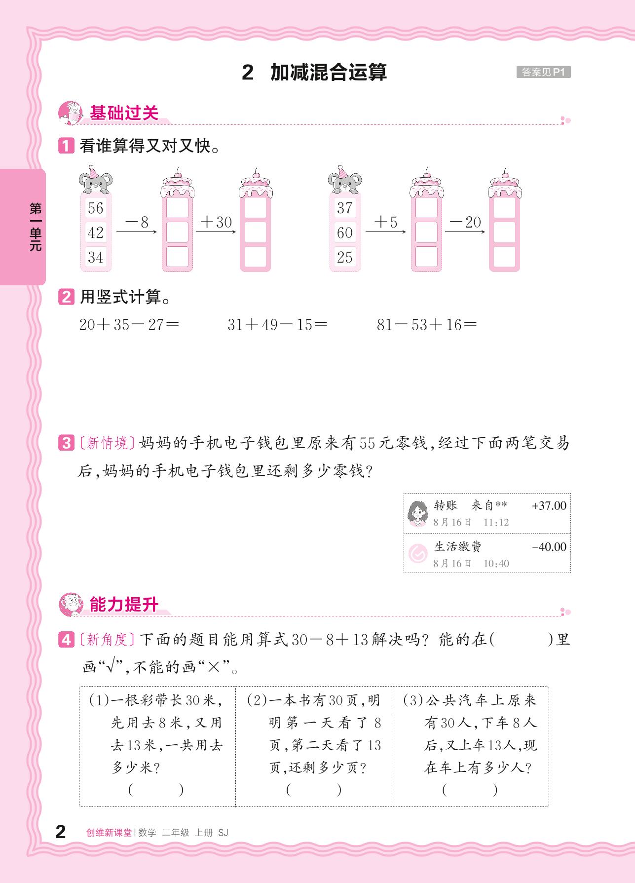 2024秋上册二年级数学苏教版 第一单元 100以内的加法和减法(三)——2. 加减混合运算