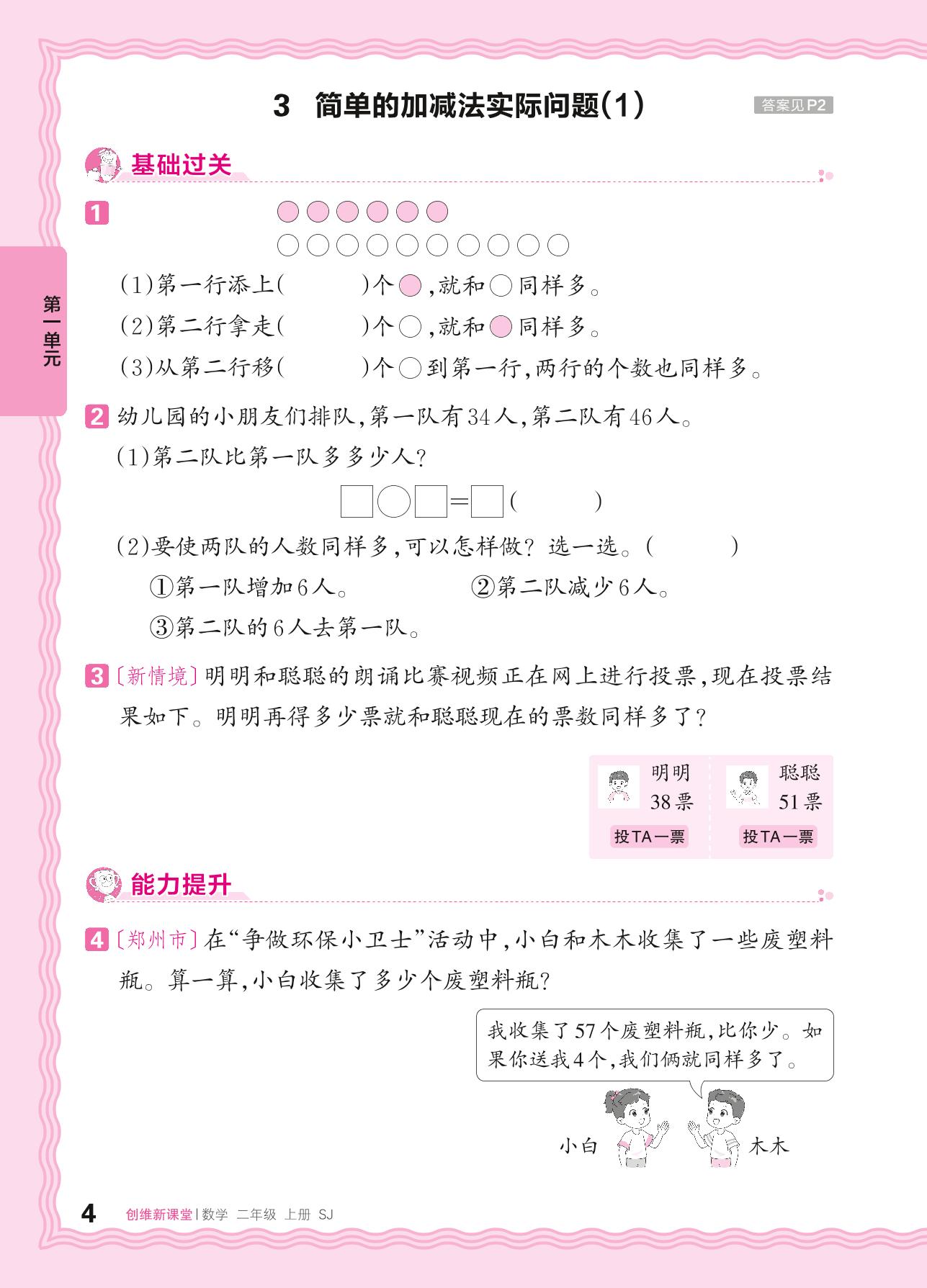 2024秋上册二年级数学苏教版 第一单元 100以内的加法和减法(三)——3. 简单的加减法实际问题(1)