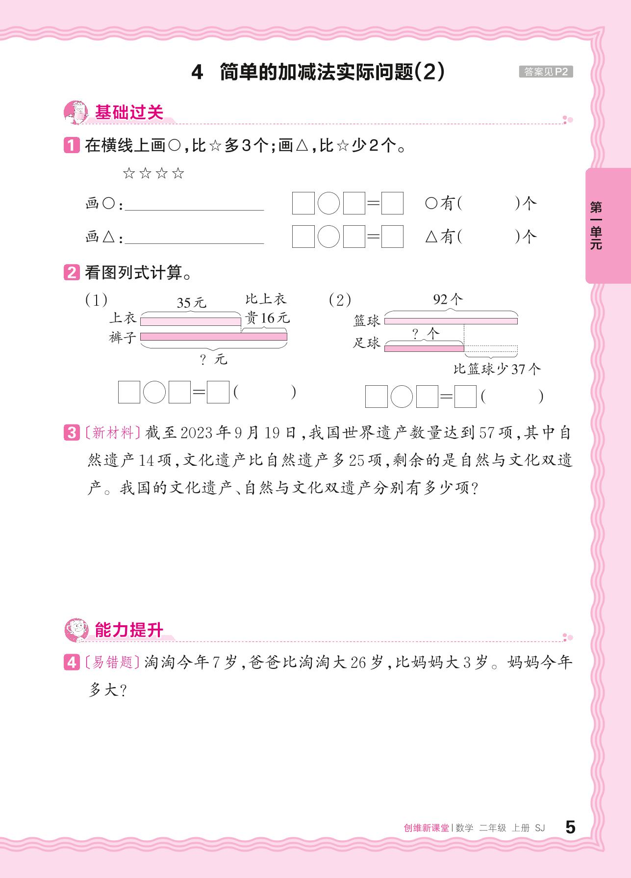 2024秋上册二年级数学苏教版 第一单元 100以内的加法和减法(三)——4. 简单的加减法实际问题(2)
