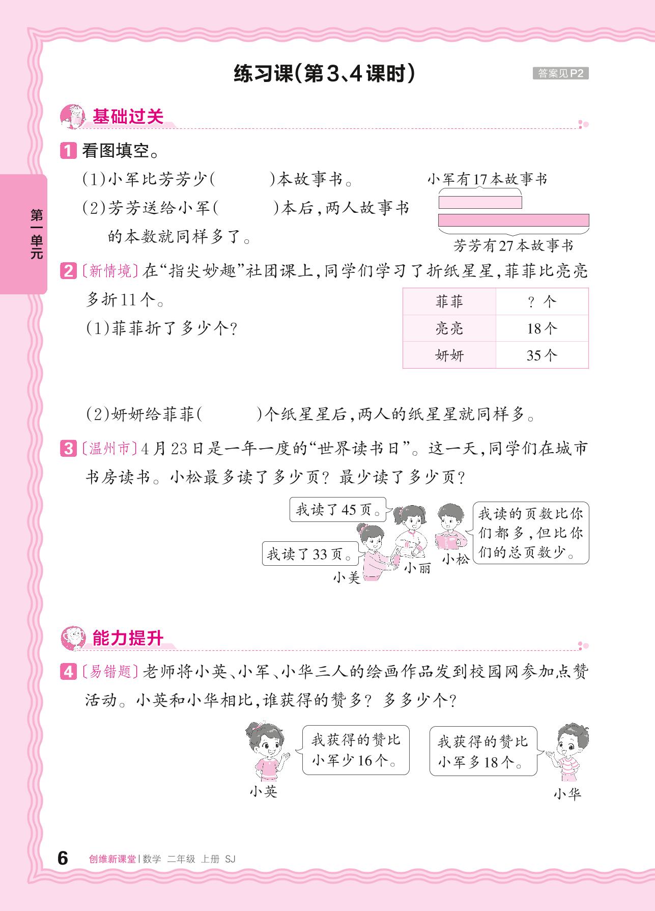 2024秋上册二年级数学苏教版 第一单元 100以内的加法和减法(三)——简单的加减法实际问题练习课
