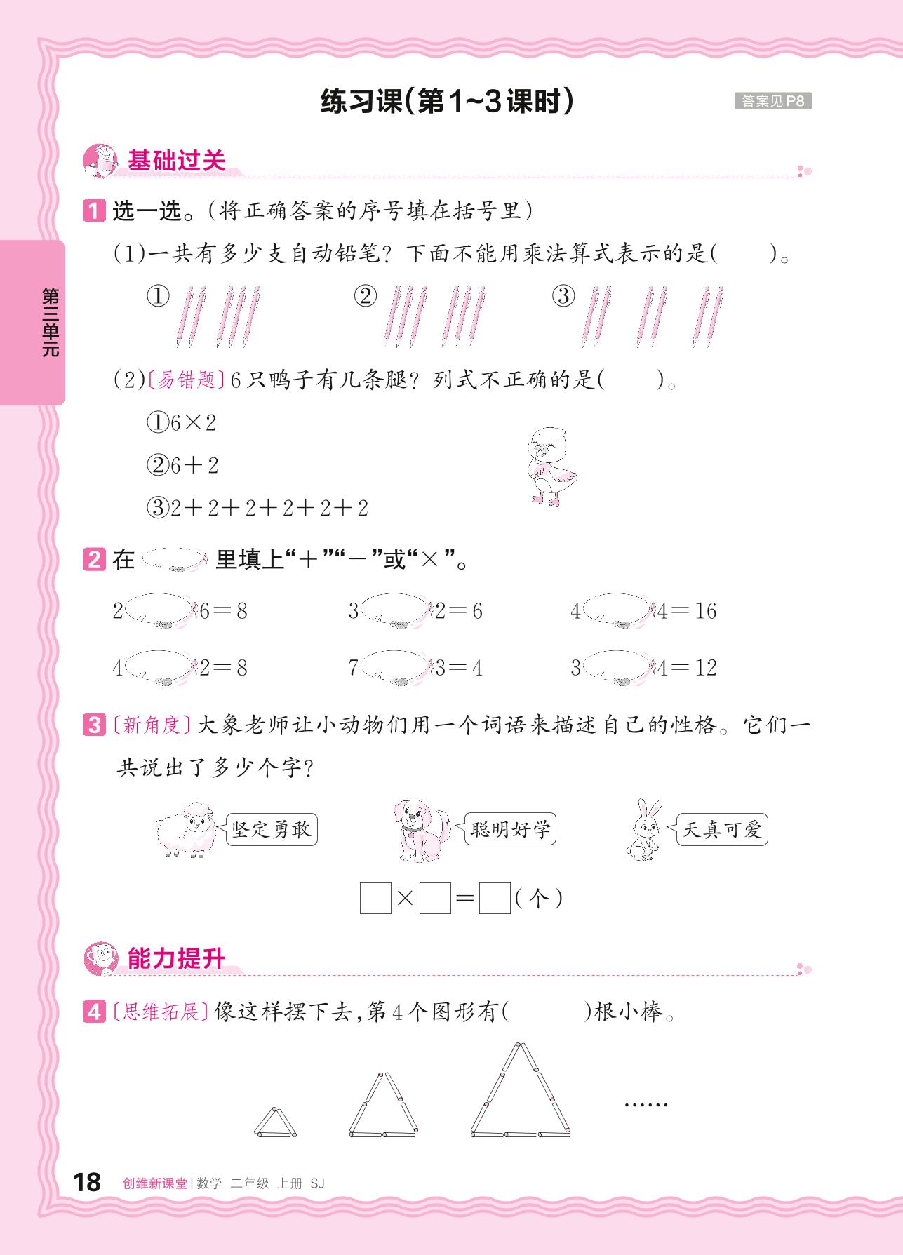 2024秋上册二年级数学苏教版 第三单元 表内乘法(一)——乘法的初步认识、1~4的乘法口诀练习课
