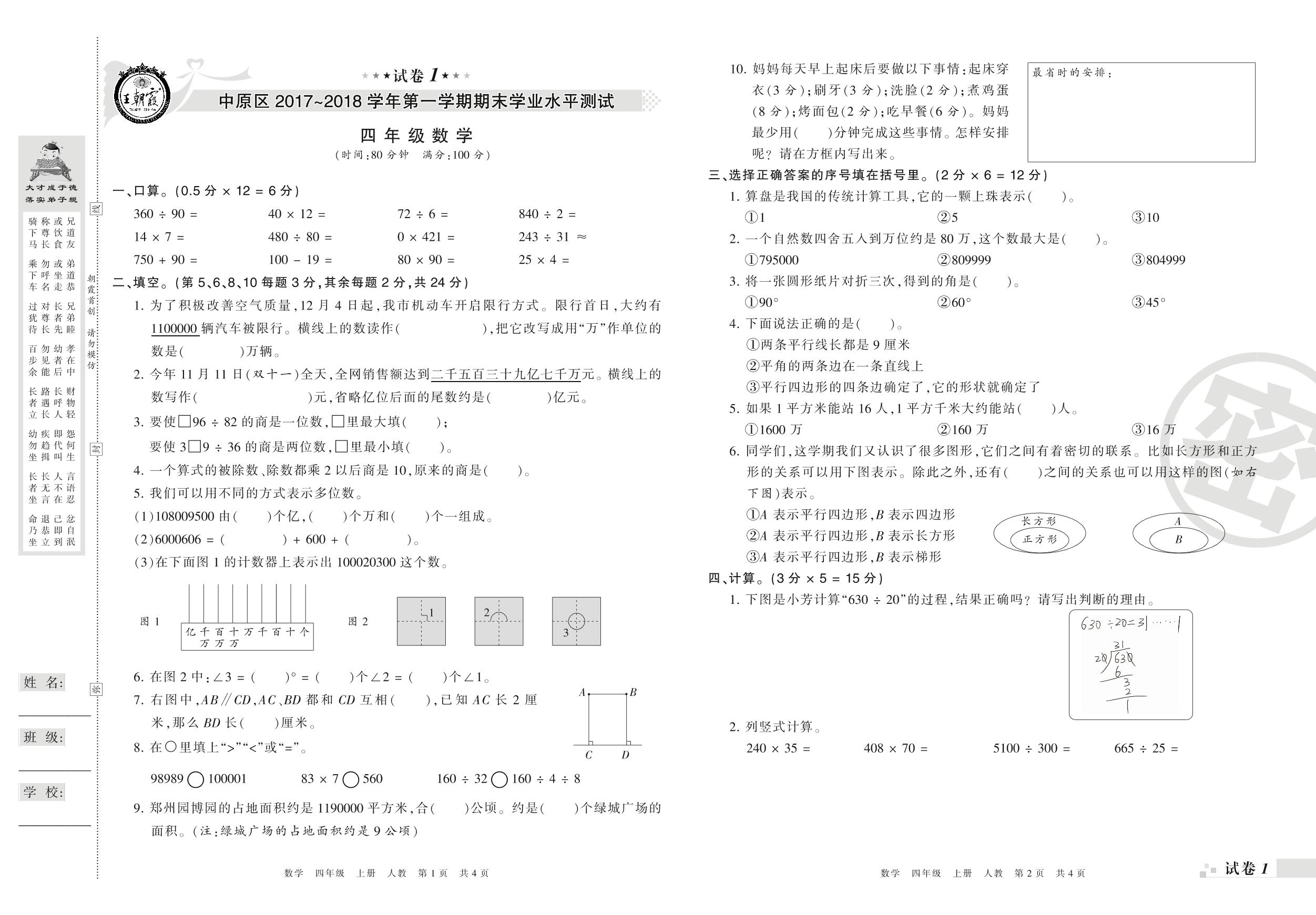 2017-2018学年第一学期郑州市中原区四年级数学试卷(人教版)_R210804155018【1】