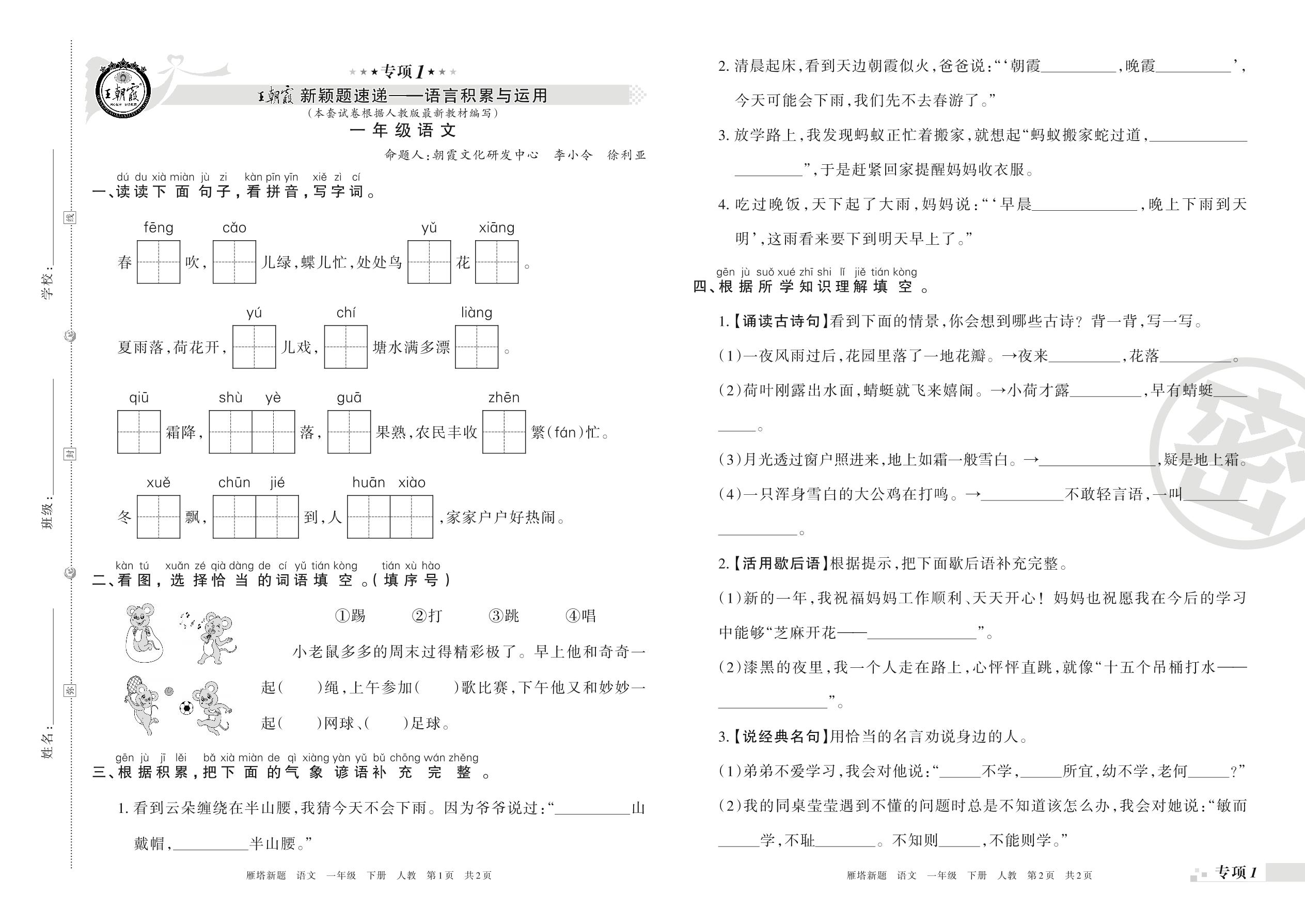 王朝霞期末专项卷——语言积累与运用、句子与口语交际真题归类复习一年级下册语文(人教版)_R210731172403【0】